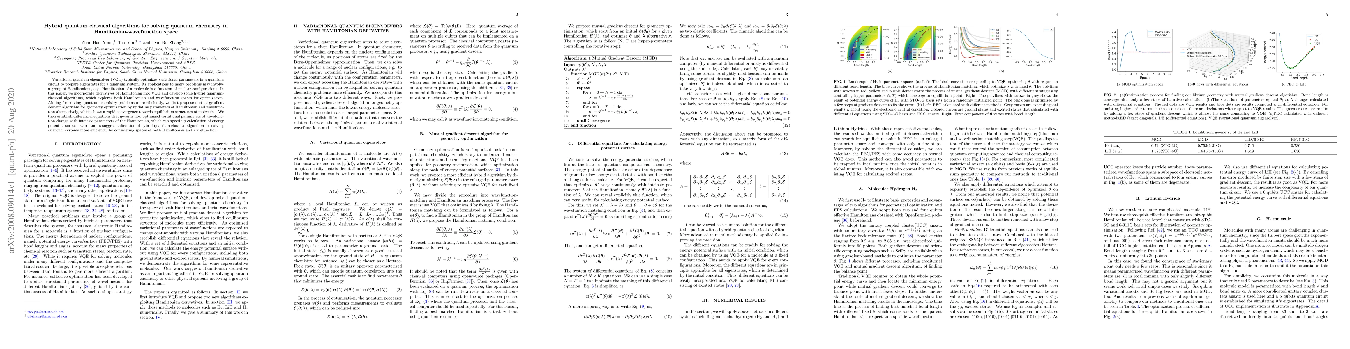 This paper proposes hybrid quantum-classical algorithms that optimize both Hamiltonian and wavefunction spaces to solve quantum chemistry problems more efficiently. The authors introduce a mutual gradient descent algorithm for rapid convergence towards equilibrium molecular structures and establish differential equations to expedite energy potential surface calculations.