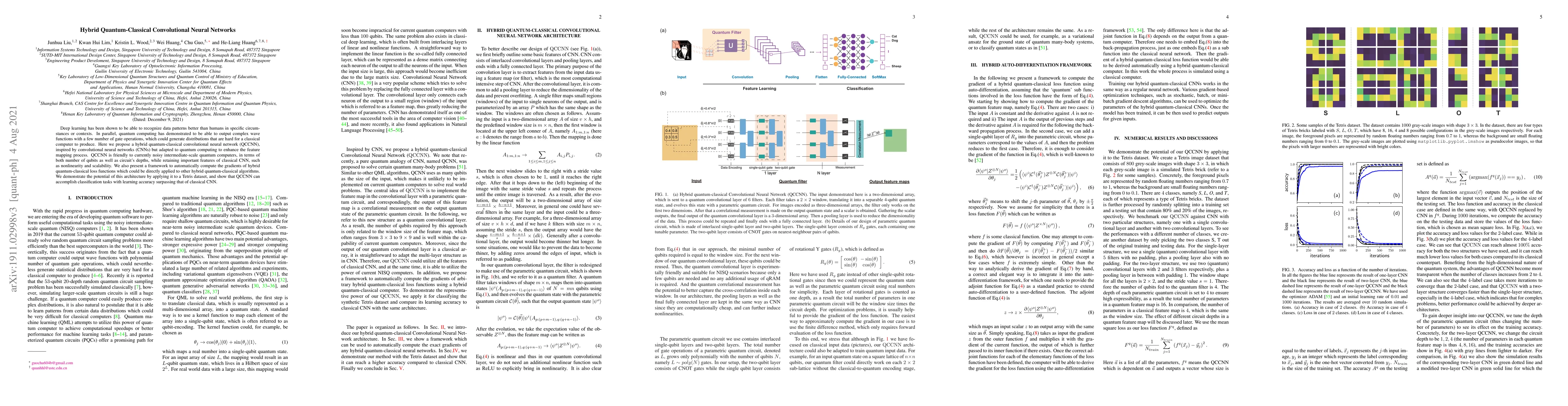 Deep learning has been shown to be able to recognize data patterns better than humans in specific circumstances or contexts. In parallel, quantum computing has demonstrated to be able to output complex wave functions with a few number of gate operations, which could generate distributions that are hard for a classical computer to produce. Here we propose a hybrid quantum-classical convolutional neural network (QCCNN), inspired by convolutional neural networks (CNNs) but adapted to quantum computing to enhance the feature mapping process. QCCNN is friendly to currently noisy intermediate-scale quantum computers, in terms of both number of qubits as well as circuit's depths, while retaining important features of classical CNN, such as nonlinearity and scalability. We also present a framework to automatically compute the gradients of hybrid quantum-classical loss functions which could be directly applied to other hybrid quantum-classical algorithms. We demonstrate the potential of this architecture by applying it to a Tetris dataset, and show that QCCNN can accomplish classification tasks with learning accuracy surpassing that of classical CNN.