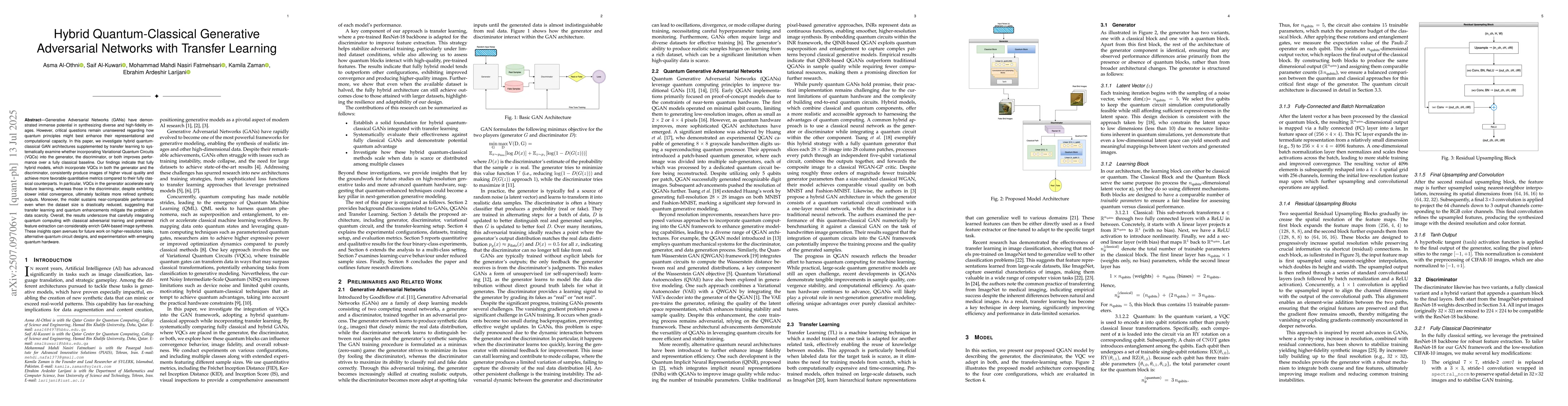 The research explores hybrid quantum-classical Generative Adversarial Networks (GANs), finding that models incorporating Variational Quantum Circuits (VQCs) in both generator and discriminator produce higher quality images and better metrics than fully classical GANs. Transfer learning and quantum enhancements also enable performance with smaller datasets, paving the way for future advancements in quantum-enhanced image synthesis.