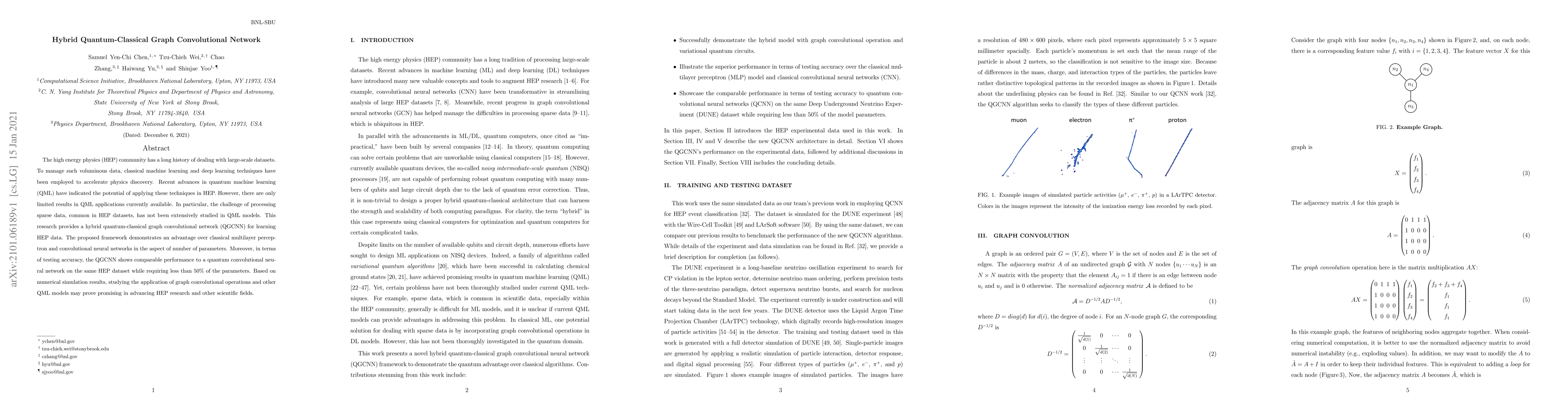 This paper introduces a hybrid quantum-classical graph convolutional network (QGCNN) for managing large-scale high energy physics datasets, demonstrating fewer parameters and comparable accuracy to quantum convolutional neural networks while addressing the challenge of sparse data. The study suggests that integrating quantum machine learning techniques could significantly advance physics research.