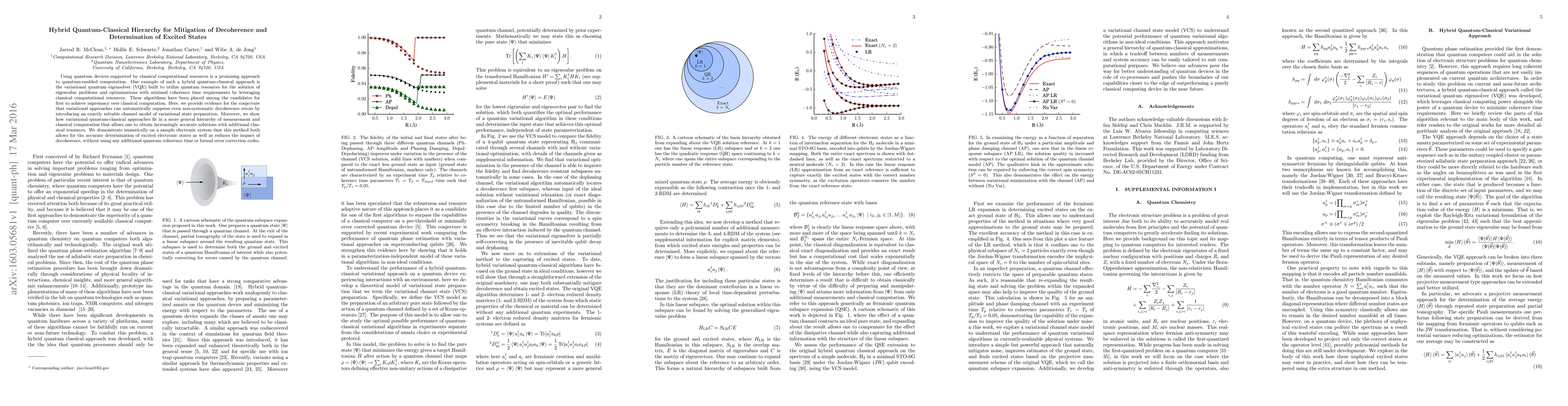 Using quantum devices supported by classical computational resources is a promising approach to quantum-enabled computation. One example of such a hybrid quantum-classical approach is the variational quantum eigensolver (VQE) built to utilize quantum resources for the solution of eigenvalue problems and optimizations with minimal coherence time requirements by leveraging classical computational resources. These algorithms have been placed among the candidates for first to achieve supremacy over classical computation. Here, we provide evidence for the conjecture that variational approaches can automatically suppress even non-systematic decoherence errors by introducing an exactly solvable channel model of variational state preparation. Moreover, we show how variational quantum-classical approaches fit in a more general hierarchy of measurement and classical computation that allows one to obtain increasingly accurate solutions with additional classical resources. We demonstrate numerically on a sample electronic system that this method both allows for the accurate determination of excited electronic states as well as reduces the impact of decoherence, without using any additional quantum coherence time or formal error correction codes.