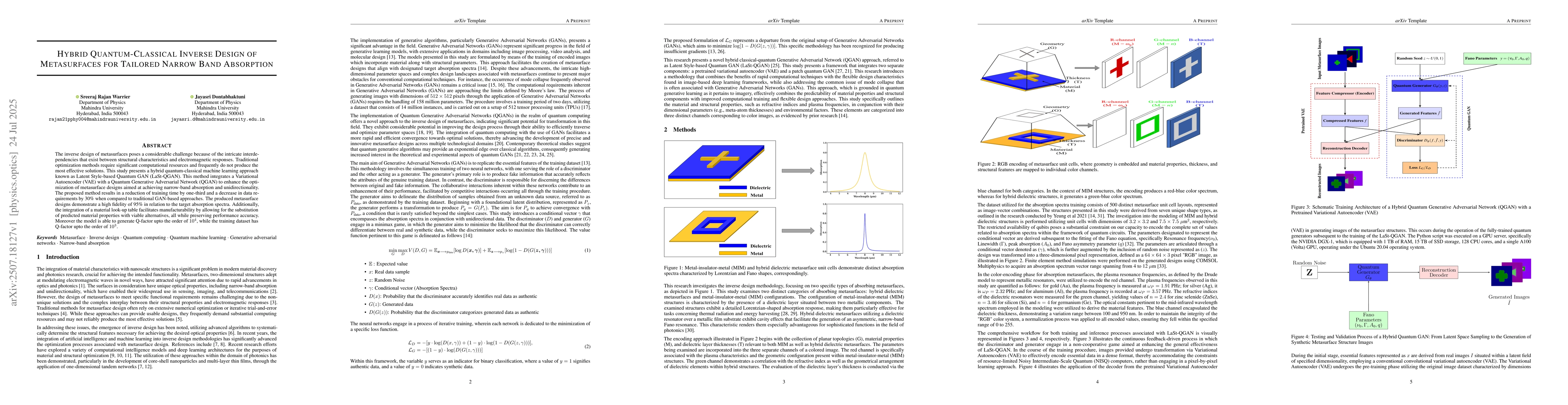 The inverse design of metasurfaces poses a considerable challenge because of the intricate interdependencies that exist between structural characteristics and electromagnetic responses. Traditional optimization methods require significant computational resources and frequently do not produce the most effective solutions. This study presents a hybrid quantum-classical machine learning approach known as Latent Style-based Quantum GAN (LaSt-QGAN). This method integrates a Variational Autoencoder (VAE) with a Quantum Generative Adversarial Network (QGAN) to enhance the optimization of metasurface designs aimed at achieving narrow-band absorption and unidirectionality. The proposed method results in a reduction of training time by one-third and a decrease in data requirements by 30\% when compared to traditional GAN-based approaches. The produced metasurface designs demonstrate a high fidelity of 95\% in relation to the target absorption spectra. Additionally, the integration of a material look-up table facilitates manufacturability by allowing for the substitution of predicted material properties with viable alternatives, all while preserving performance accuracy. Moreover the model is able to generate Q-factor upto the order of $10^4$, while the training dataset has Q-factor upto the order of $10^3$.