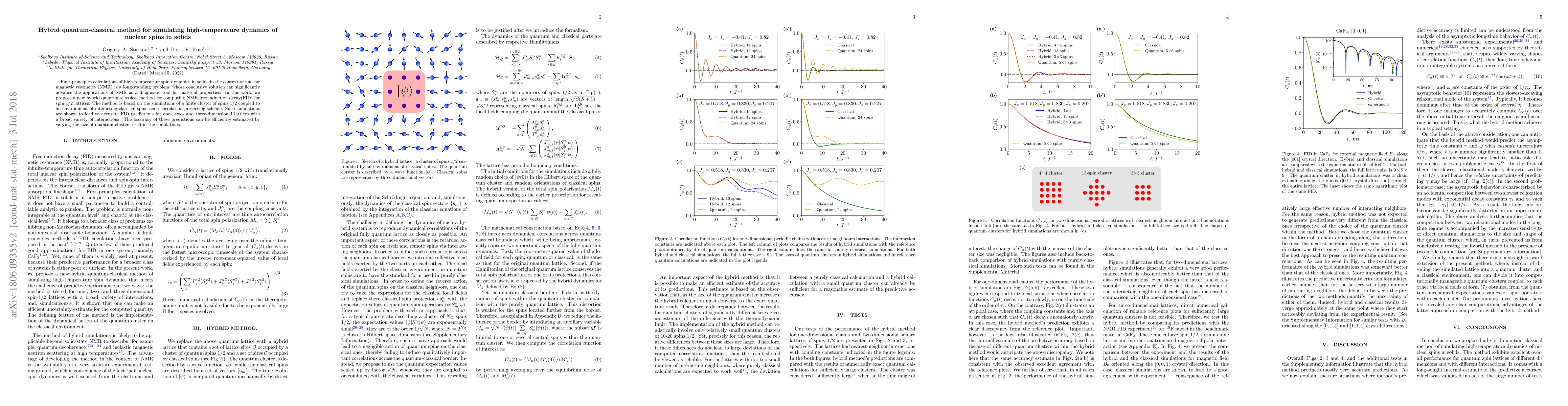 First-principles calculations of high-temperature spin dynamics in solids in the context of nuclear magnetic resonance (NMR) is a long-standing problem, whose conclusive solution can significantly advance the applications of NMR as a diagnostic tool for material properties. In this work, we propose a new hybrid quantum-classical method for computing NMR free induction decay(FID) for spin $1/2$ lattices. The method is based on the simulations of a finite cluster of spins $1/2$ coupled to an environment of interacting classical spins via a correlation-preserving scheme. Such simulations are shown to lead to accurate FID predictions for one-, two- and three-dimensional lattices with a broad variety of interactions. The accuracy of these predictions can be efficiently estimated by varying the size of quantum clusters used in the simulations.