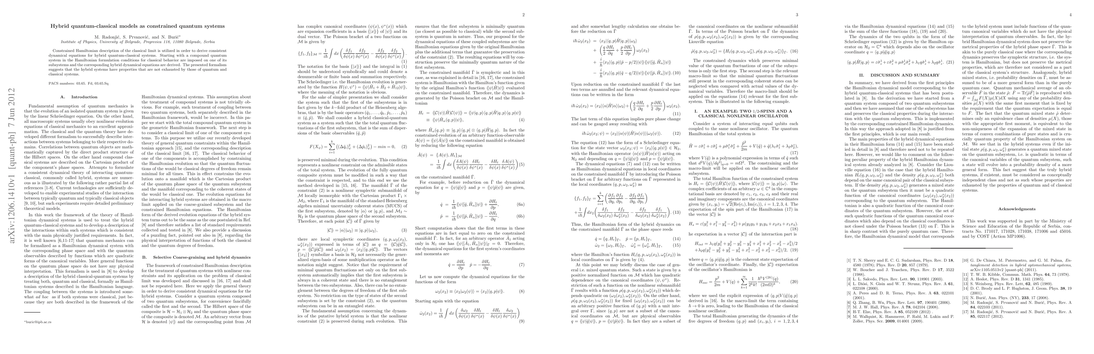 This paper develops a constrained Hamiltonian framework for hybrid quantum-classical systems, deriving dynamical equations that reveal unique properties beyond those of purely quantum or classical systems. The approach imposes classical behavior conditions on a quantum subsystem to achieve this.