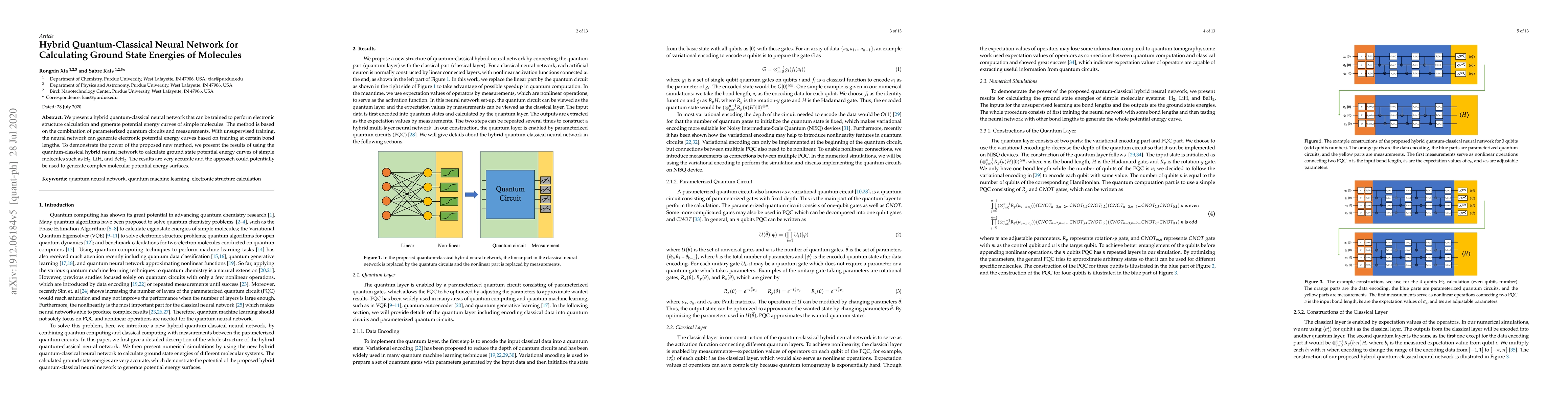 This paper introduces a hybrid quantum-classical neural network for calculating ground state energies of molecules, combining parameterized quantum circuits and measurements. The method accurately generates potential energy curves for simple molecules like H$_2$, LiH, and BeH$_2$, demonstrating its potential for complex molecular potential energy surfaces.