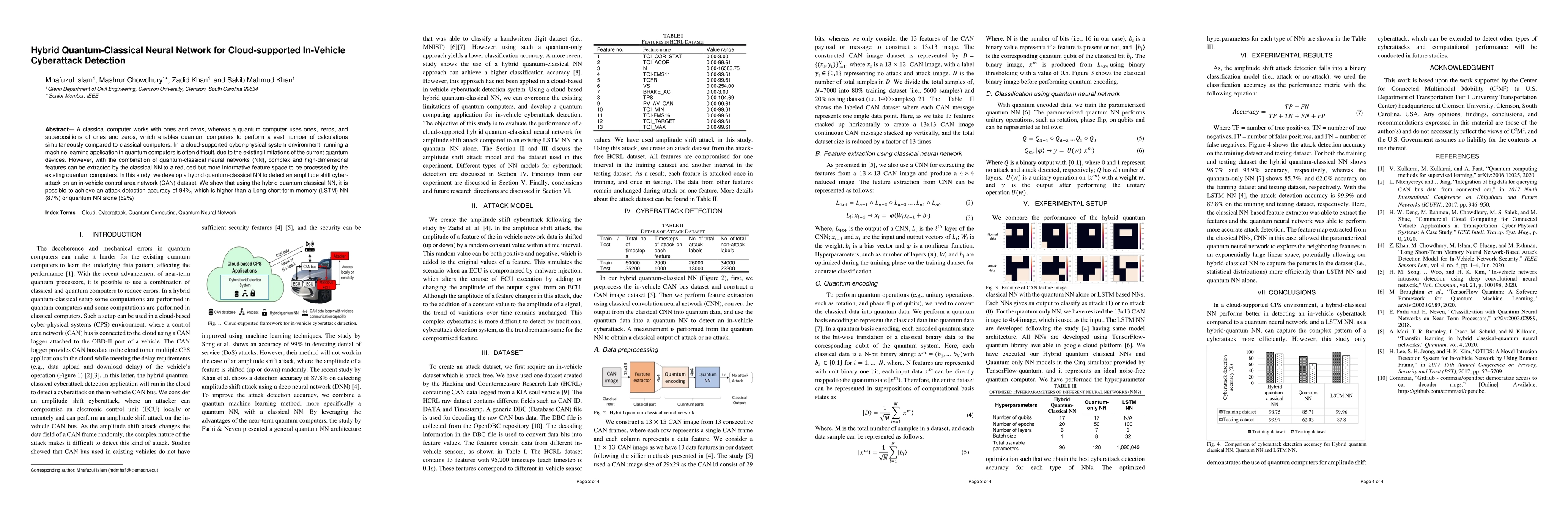 This study develops a hybrid quantum-classical neural network to detect cyberattacks in in-vehicle control systems, achieving 94% accuracy. It leverages classical NNs for feature reduction before processing with quantum computers, outperforming both LSTM and quantum NNs alone.