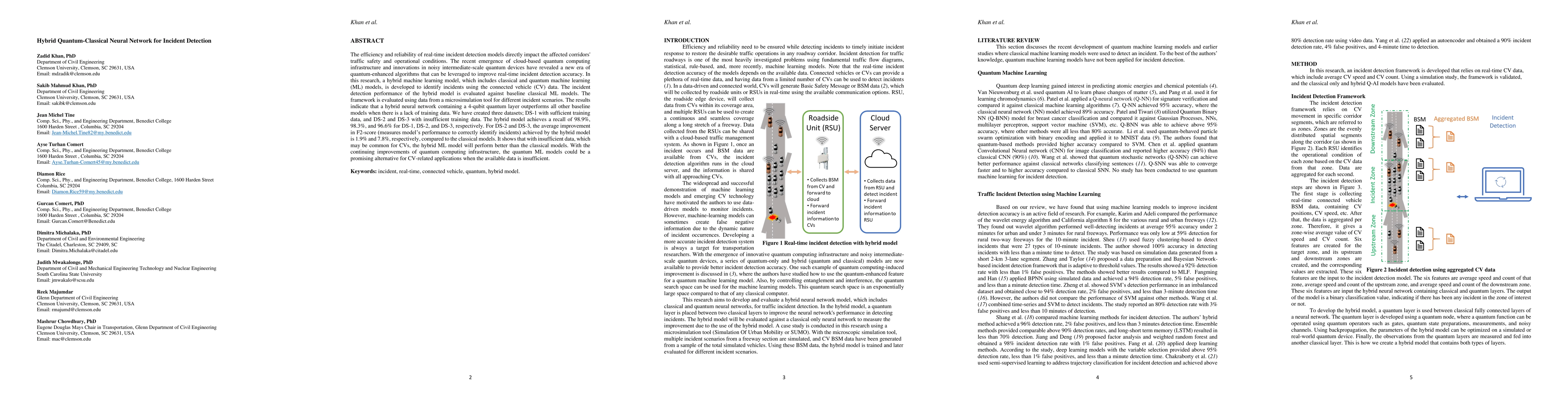 This research develops a hybrid quantum-classical neural network to improve real-time incident detection using connected vehicle data. The hybrid model, which includes both classical and quantum machine learning layers, outperforms classical models, especially when training data is limited, showing significant improvement in F2-score by 1.9% and 7.8% for datasets with insufficient training data.