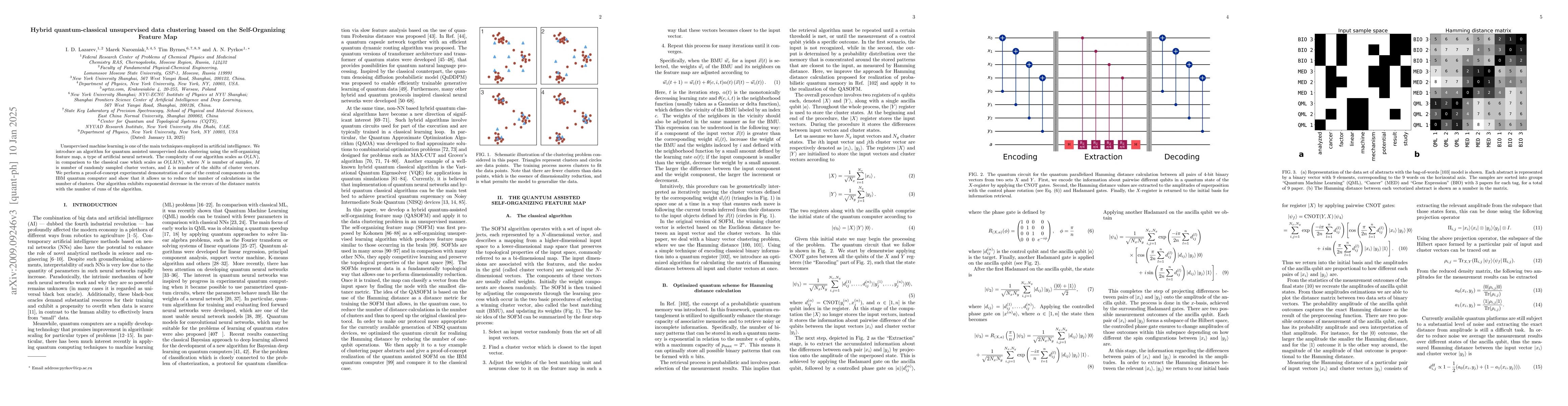 This paper proposes a hybrid quantum-classical algorithm for unsupervised data clustering using the self-organizing feature map. The authors demonstrate a proof-of-concept on IBM Q Experience, showing reduced computational requirements compared to classical methods, and validate the approach with a text clustering example.