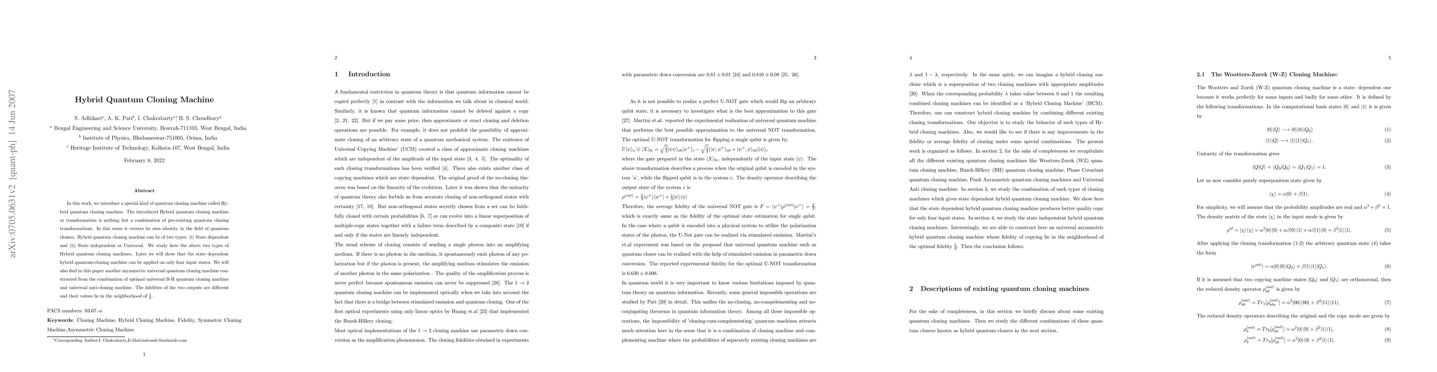 This paper introduces a novel Hybrid Quantum Cloning Machine, combining existing quantum cloning transformations into either state-dependent or universal types. It demonstrates the application of the state-dependent variant on four input states and presents an asymmetric universal quantum cloning machine with differing fidelities for its two outputs, around ${5/6}$.