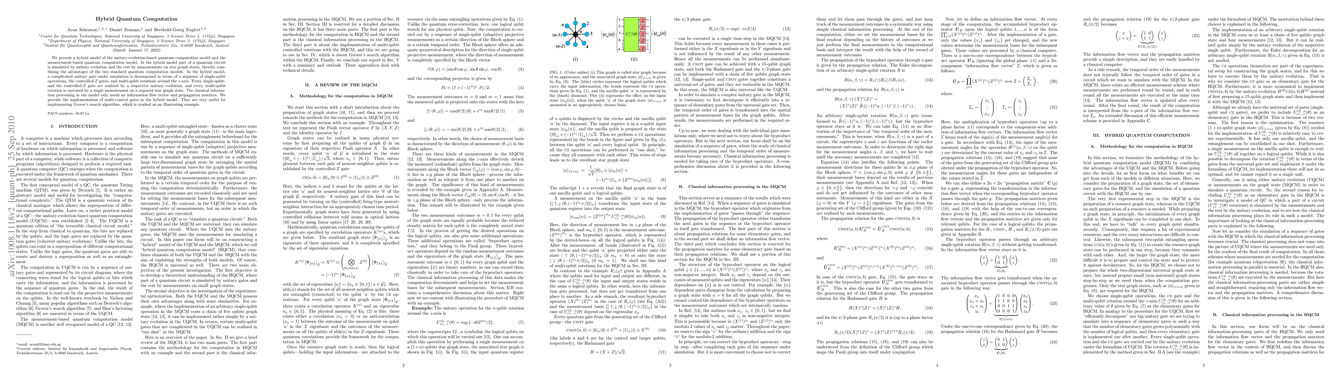 This paper introduces a hybrid quantum computation model combining unitary evolution and measurement-based computation, utilizing star graph states for efficient execution. The model decomposes complex unitary gates into single-qubit operations and controlled-Z gates, showcasing its application in Grover's search algorithm.
