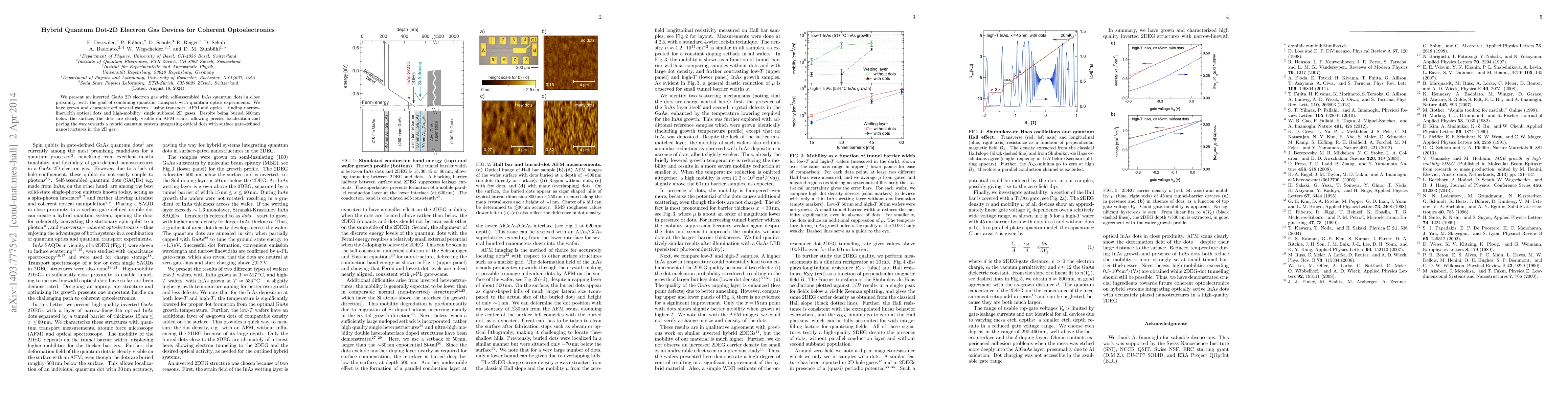 The research presents a hybrid quantum dot-2D electron gas device using an inverted GaAs 2D electron gas with embedded InAs quantum dots. These devices combine quantum transport with quantum optics, demonstrating narrow-linewidth optical dots and high-mobility 2D gases. Despite being buried, the dots are visible via AFM, enabling precise localization for a potential hybrid quantum system.