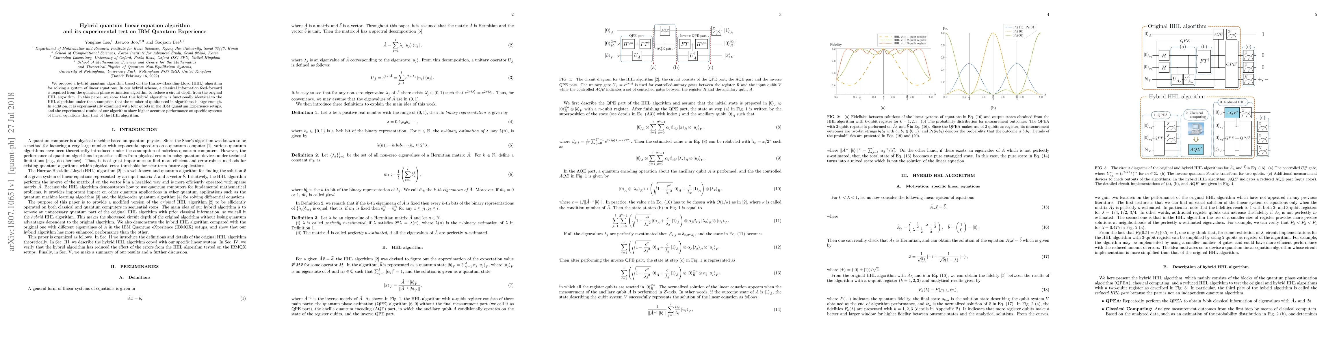 This paper proposes a hybrid quantum algorithm based on the HHL method for solving linear equations, incorporating classical information to reduce circuit depth. Experimentally tested on IBM Quantum Experience with four qubits, the hybrid algorithm demonstrates higher accuracy for specific linear systems compared to the original HHL algorithm.