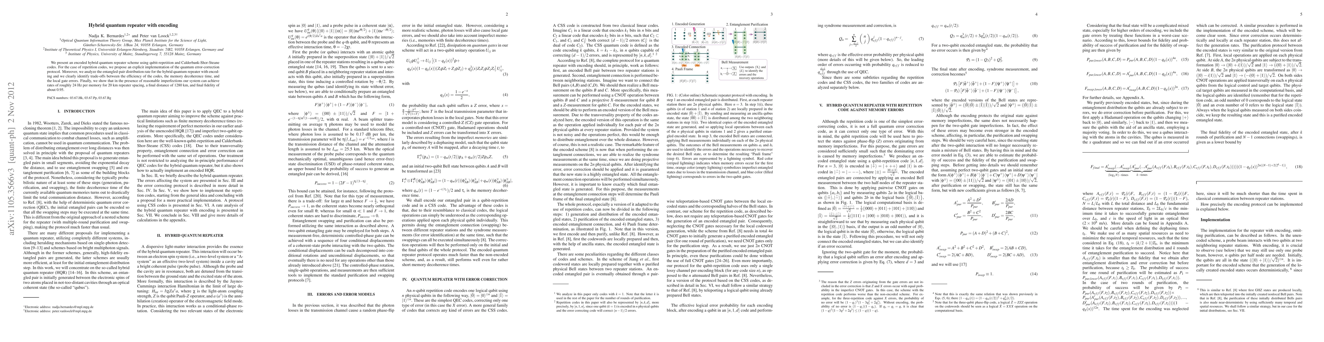 This paper proposes an encoded hybrid quantum repeater scheme utilizing qubit-repetition and Calderbank-Shor-Steane codes, with an explicit implementation of the quantum error-correction protocol. The study identifies a trade-off between code efficiency, memory decoherence, and local gate errors, achieving a rate of 24 Hz per memory for a 1280 km distance with a fidelity of 0.95.