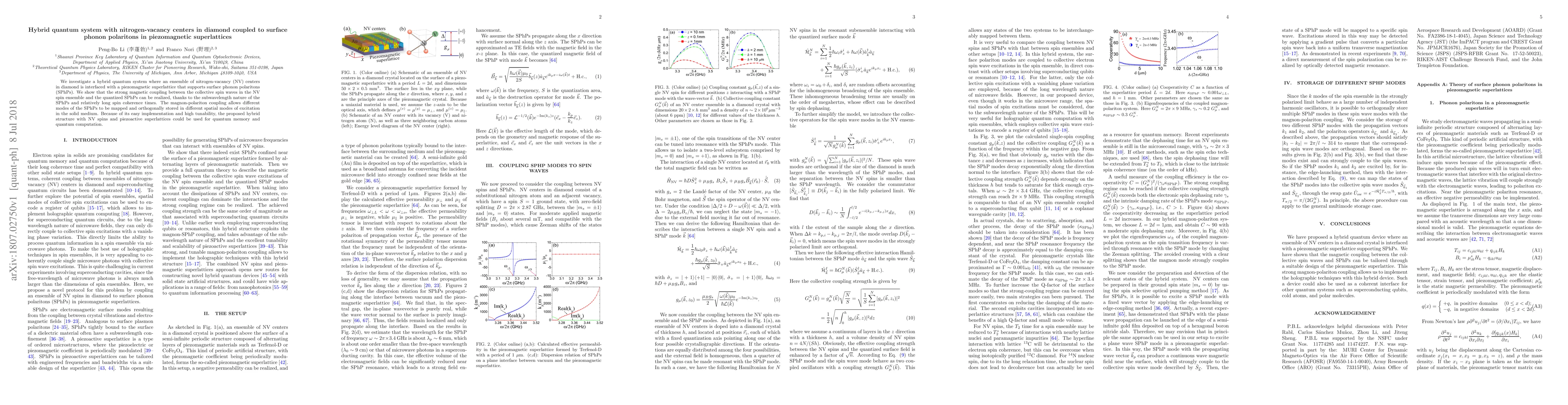 This paper explores a hybrid quantum system combining nitrogen-vacancy centers in diamond with surface phonon polaritons in piezomagnetic superlattices, demonstrating strong magnetic coupling and potential for quantum memory and computation applications. The system's tunability and subwavelength nature facilitate mapping and storing different modes of excitation.