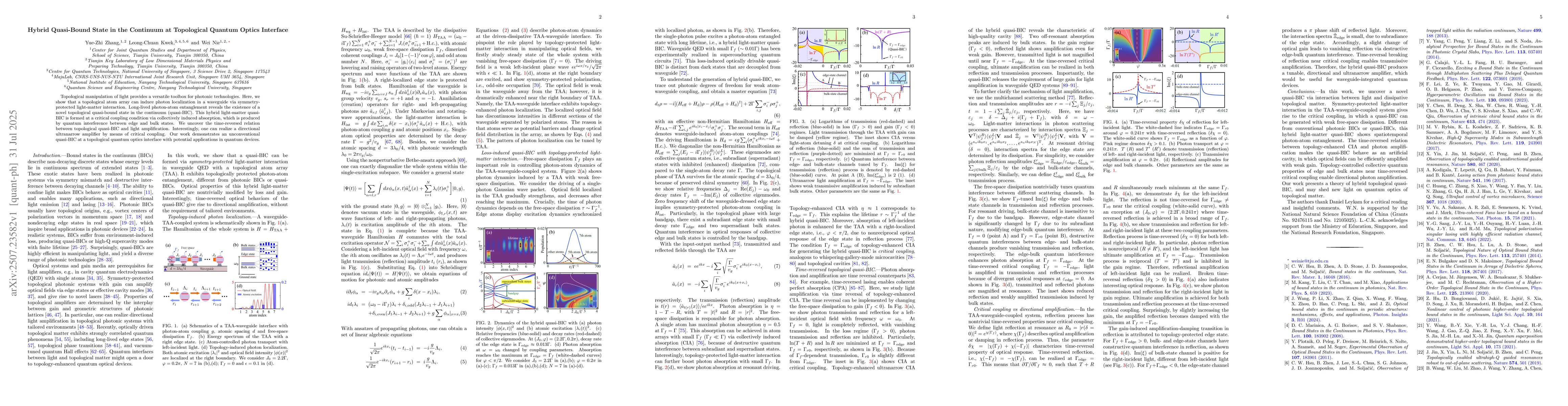 Topological manipulation of light provides a versatile toolbox for photonic technologies. Here, we show that a topological atom array can induce photon localization in a waveguide via symmetry-protected light-matter interaction. Long-lived photon-atom entanglement reveals the existence of a novel topological quasi-bound state in the continuum (quasi-BIC). This hybrid light-matter quasi-BIC is formed at a critical coupling condition via collectively induced absorption, which is produced by quantum interference between edge and bulk states. We uncover the time-reversed relation between topological quasi-BIC and light amplification. Interestingly, one can realize a directional ultranarrow amplifier by means of critical coupling. Our work demonstrates an unconventional quasi-BIC at a topological quantum optics interface with potential applications in quantum devices.