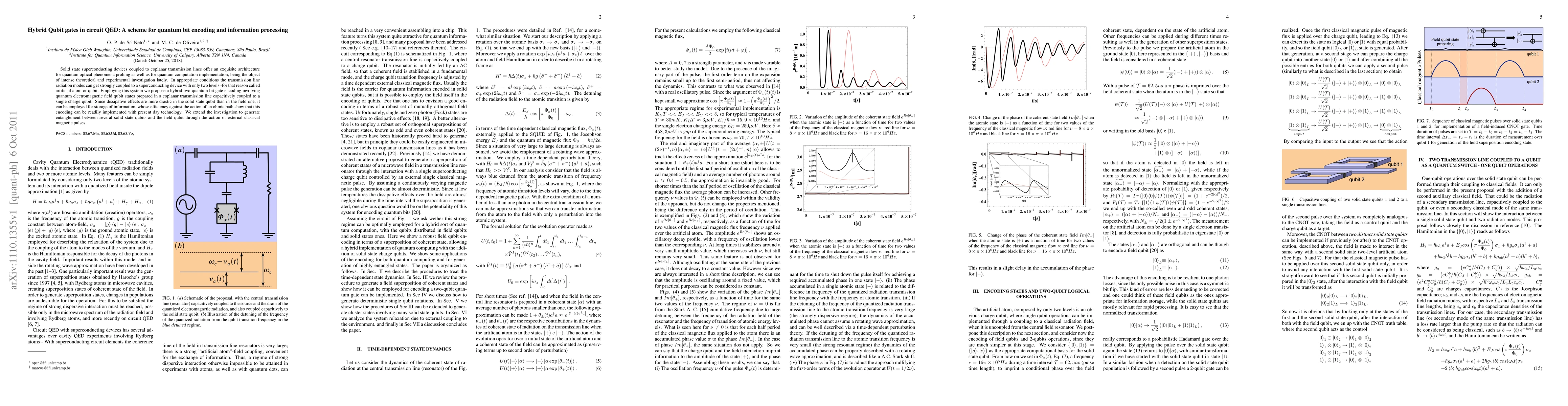 Solid state superconducting devices coupled to coplanar transmission lines offer an exquisite architecture for quantum optical phenomena probing as well as for quantum computation implementation, being the object of intense theoretical and experimental investigation lately. In appropriate conditions the transmission line radiation modes can get strongly coupled to a superconducting device with only two levels -for that reason called artificial atom or qubit. Employing this system we propose a hybrid two-quantum bit gate encoding involving quantum electromagnetic field qubit states prepared in a coplanar transmission line capacitively coupled to a single charge qubit. Since dissipative effects are more drastic in the solid state qubit than in the field one, it can be employed for storage of information, whose efficiency against the action of an ohmic bath show that this encoding can be readily implemented with present day technology. We extend the investigation to generate entanglement between several solid state qubits and the field qubit through the action of external classical magnetic pulses.