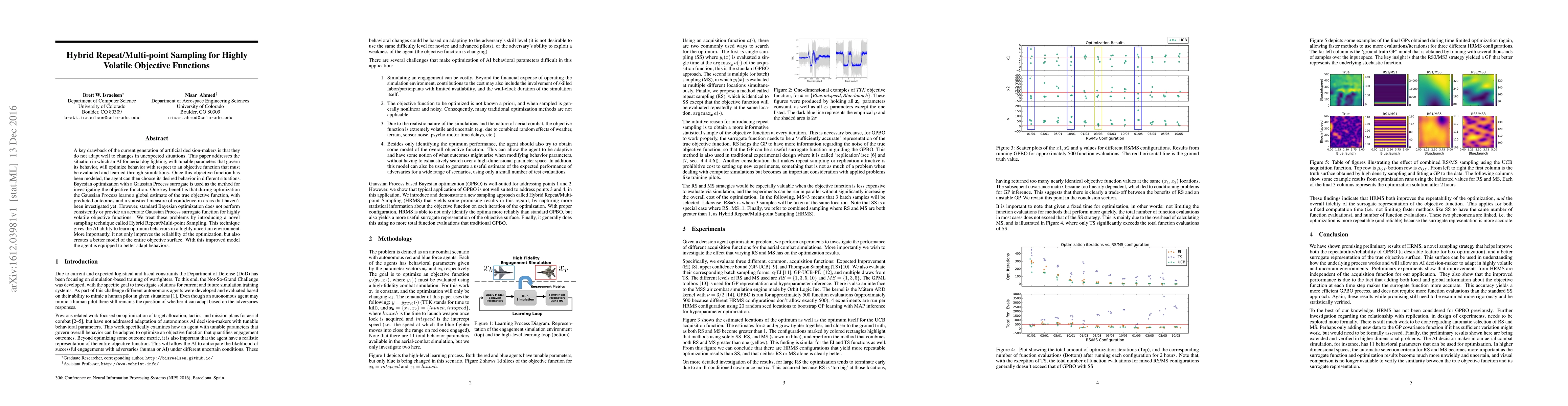 This paper introduces Hybrid Repeat/Multi-point Sampling to enhance Bayesian optimization for AI systems, specifically for aerial dog fighting simulations. The technique improves the reliability and accuracy of the Gaussian Process surrogate model for highly volatile objective functions, enabling better adaptation and behavior optimization in uncertain environments.