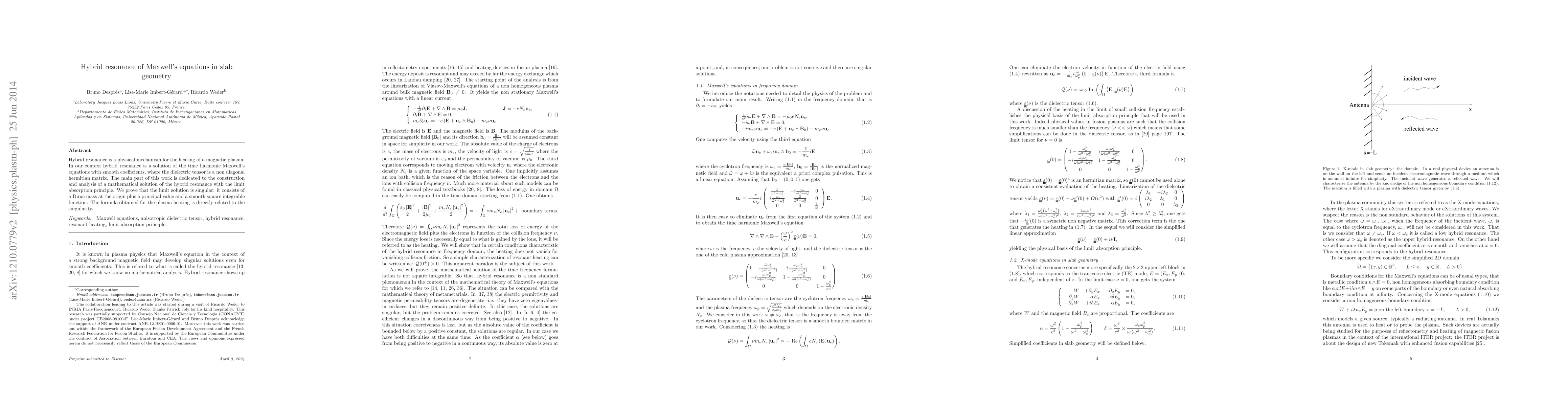 Hybrid resonance is a physical mechanism for the heating of a magnetic plasma. In our context hybrid resonance is a solution of the time harmonic Maxwell's equations with smooth coefficients, where the dielectric tensor is a non diagonal hermitian matrix. The main part of this work is dedicated to the construction and analysis of a mathematical solution of the hybrid resonance with the limit absorption principle. We prove that the limit solution is singular: it is constituted of a Dirac mass at the origin plus a principle value and a smooth square integrable function. The formula obtained for the plasma heating is directly related to the singularity.