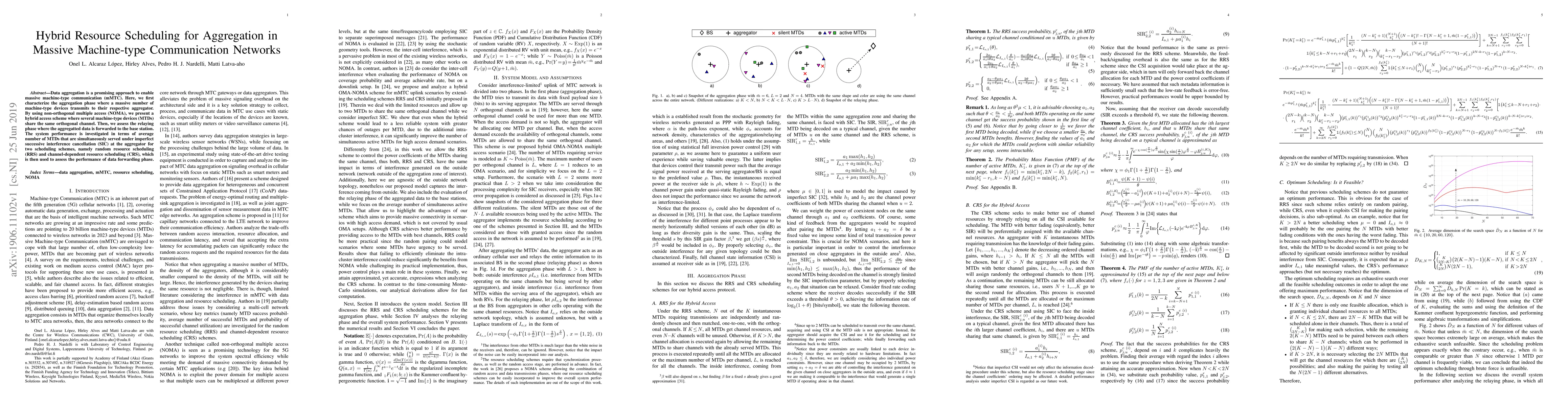 Data aggregation is a promising approach to enable massive machine-type communication (mMTC). Here, we first characterize the aggregation phase where a massive number of machine-type devices transmits to their respective aggregator. By using non-orthogonal multiple access (NOMA), we present a hybrid access scheme where several machine-type devices (MTDs) share the same orthogonal channel. Then, we assess the relaying phase where the aggregatted data is forwarded to the base station. The system performance is investigated in terms of average number of MTDs that are simultaneously served under imperfect successive interference cancellation (SIC) at the aggregator for two scheduling schemes, namely random resource scheduling (RRS) and channel-dependent resource scheduling (CRS), which is then used to assess the performance of data forwarding phase.