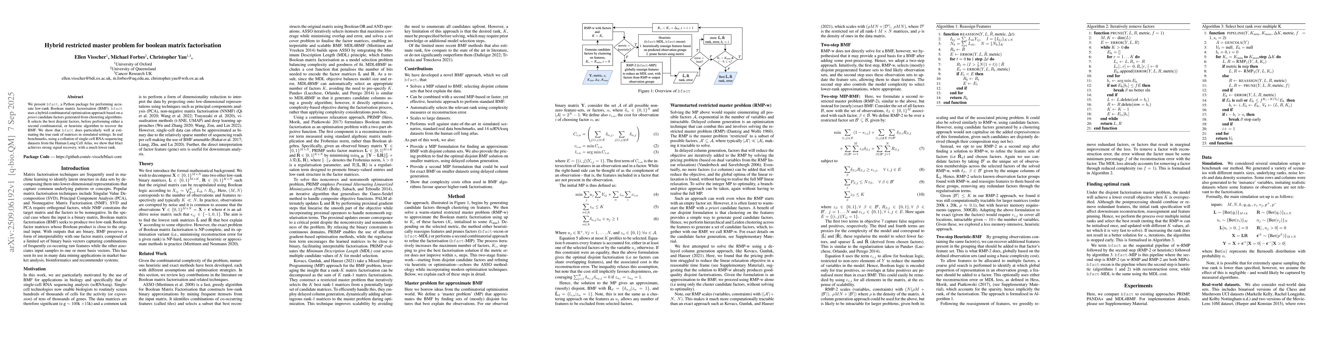 We present bfact, a Python package for performing accurate low-rank Boolean matrix factorisation (BMF). bfact uses a hybrid combinatorial optimisation approach based on a priori candidate factors generated from clustering algorithms. It selects the best disjoint factors before performing either a second combinatorial or heuristic algorithm to recover the BMF. We show that bfact does particularly well at estimating the true rank of matrices in simulated settings. In real benchmarks, using a collation of single-cell RNA-sequencing datasets from the Human Lung Cell Atlas, we show that bfact achieves strong signal recovery, with a much lower rank.