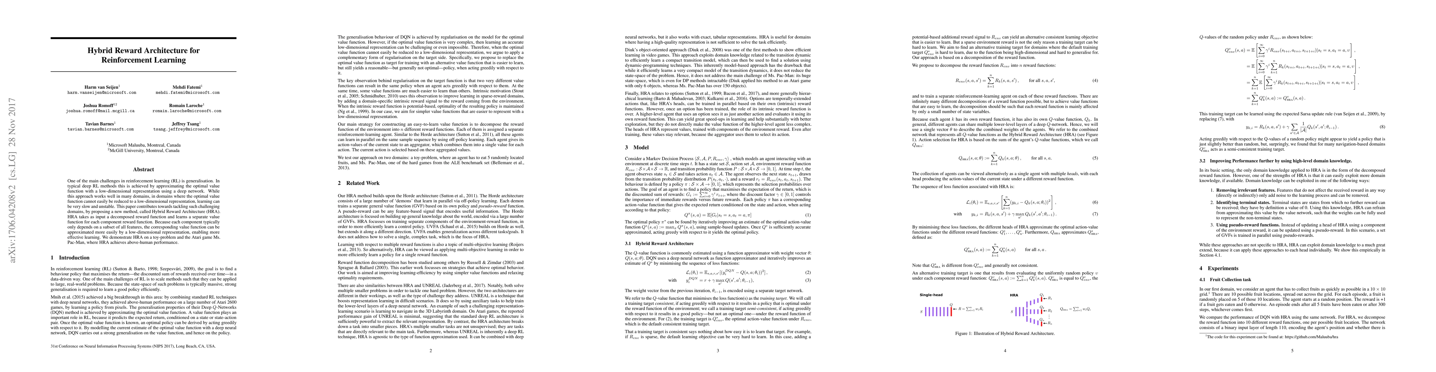 This paper proposes the Hybrid Reward Architecture (HRA) to tackle reinforcement learning challenges in domains where optimal value functions cannot be easily reduced. HRA decomposes the reward function into components, learning separate value functions for each, which can be more easily approximated, leading to more effective and stable learning. Demonstrated on a toy problem and Atari's Ms. Pac-Man, HRA achieves above-human performance.