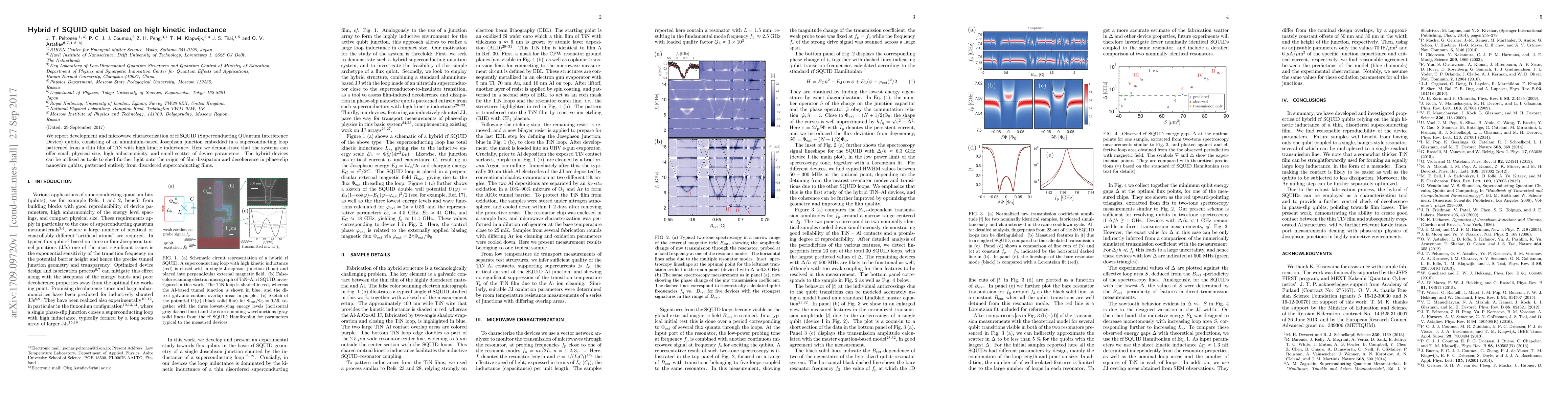 We report development and microwave characterization of rf SQUID (Superconducting QUantum Interference Device) qubits, consisting of an aluminium-based Josephson junction embedded in a superconducting loop patterned from a thin film of TiN with high kinetic inductance. Here we demonstrate that the systems can offer small physical size, high anharmonicity, and small scatter of device parameters. The hybrid devices can be utilized as tools to shed further light onto the origin of film dissipation and decoherence in phase-slip nanowire qubits, patterned entirely from disordered superconducting films.