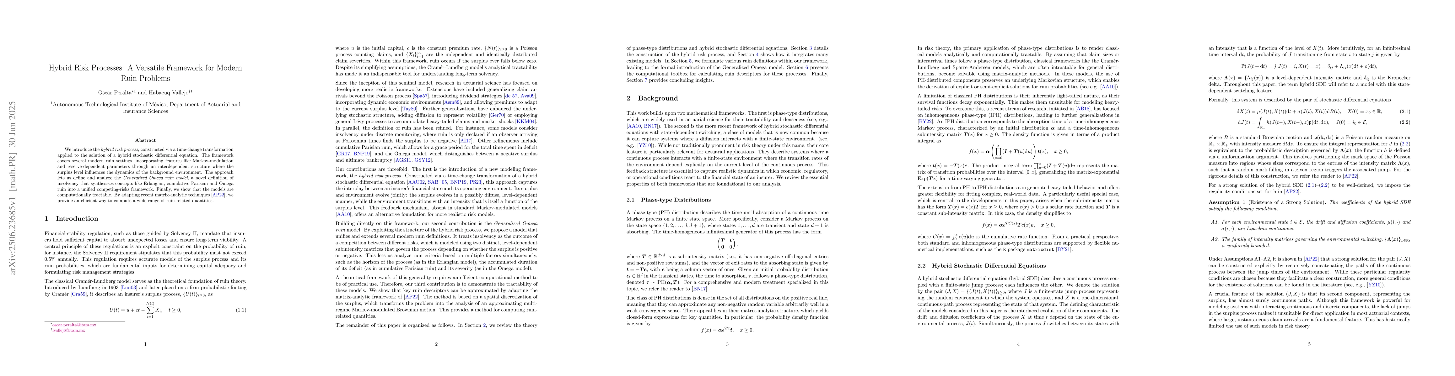 We introduce the hybrid risk process, constructed via a time-change transformation applied to the solution of a hybrid stochastic differential equation. The framework covers several modern ruin settings, incorporating features like Markov-modulation and reserve-dependent parameters through an interdependent structure where the surplus level influences the dynamics of the background environment. The approach lets us define and analyze the Generalized Omega ruin model, a novel definition of insolvency that synthesizes concepts like Erlangian, cumulative Parisian and Omega ruin into a unified competing-risks framework. Finally, we show that the models are computationally tractable. By adapting recent matrix-analytic techniques, we provide an efficient way to compute a wide range of ruin-related quantities.