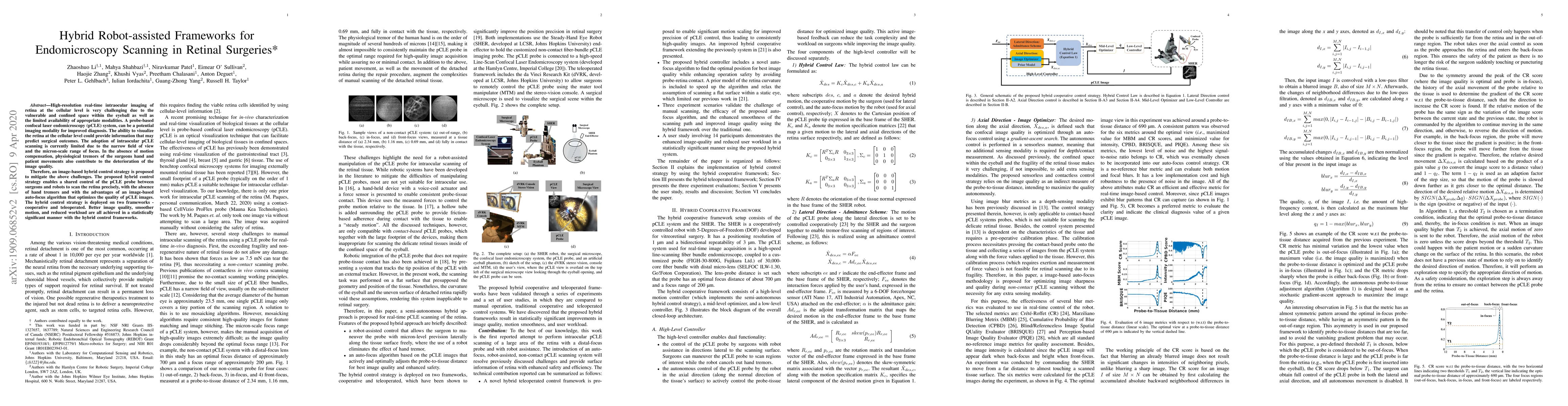 This research proposes a hybrid control strategy for probe-based confocal laser endomicroscopy (pCLE) in retinal surgeries, addressing challenges of narrow field of view and image degradation due to tremors. The strategy, implemented in cooperative and teleoperated frameworks, enhances image quality, motion smoothness, and reduces surgeon workload, potentially improving diagnostic accuracy in retinal surgeries.