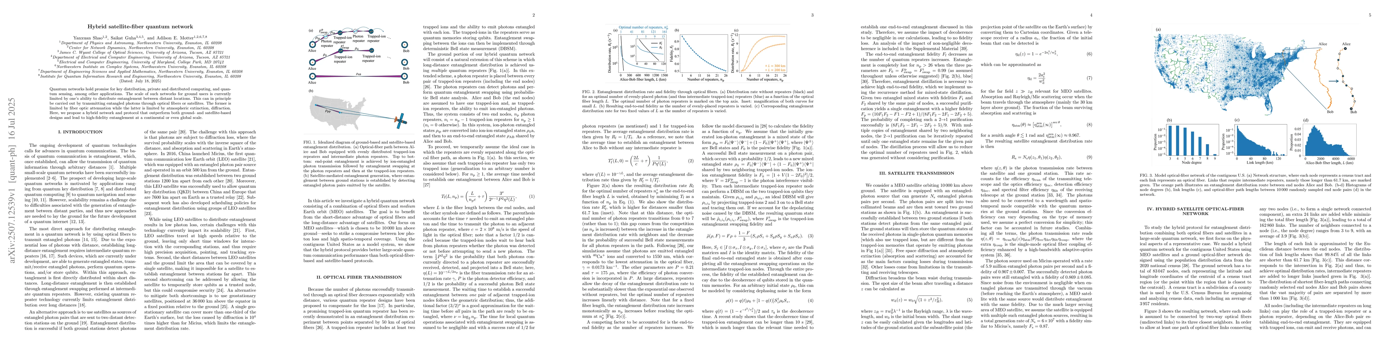 Quantum networks hold promise for key distribution, private and distributed computing, and quantum sensing, among other applications. The scale of such networks for ground users is currently limited by one's ability to distribute entanglement between distant locations. This can in principle be carried out by transmitting entangled photons through optical fibers or satellites. The former is limited by fiber optic attenuation while the latter is limited by atmospheric extinction and diffraction. Here, we propose a hybrid network and protocol that outperform both ground- and satellite-based designs and lead to high-fidelity entanglement at a continental or even global scale.