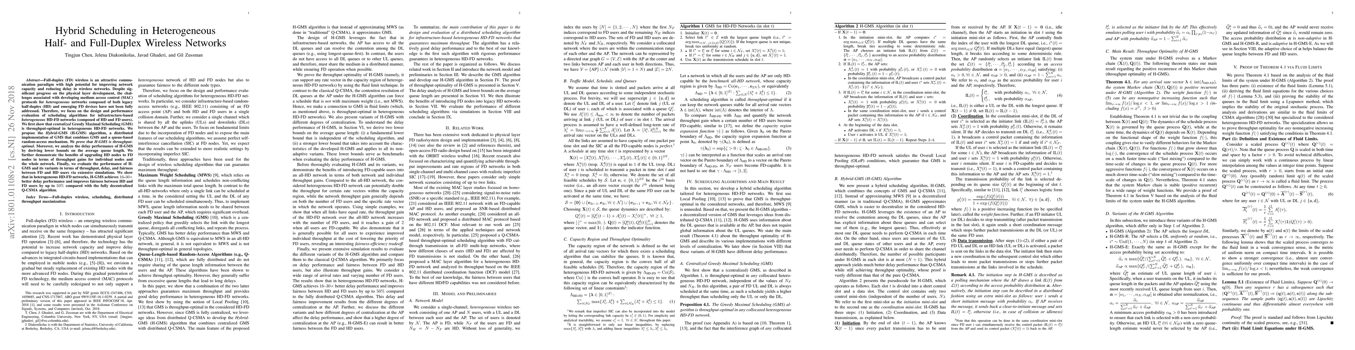This paper proposes a Hybrid-GMS (H-GMS) scheduling algorithm for heterogeneous half-duplex (HD) and full-duplex (FD) wireless networks, demonstrating its throughput-optimality and improved delay performance. Simulations show H-GMS achieves significantly better delay and fairness compared to existing decentralized Q-CSMA algorithms.