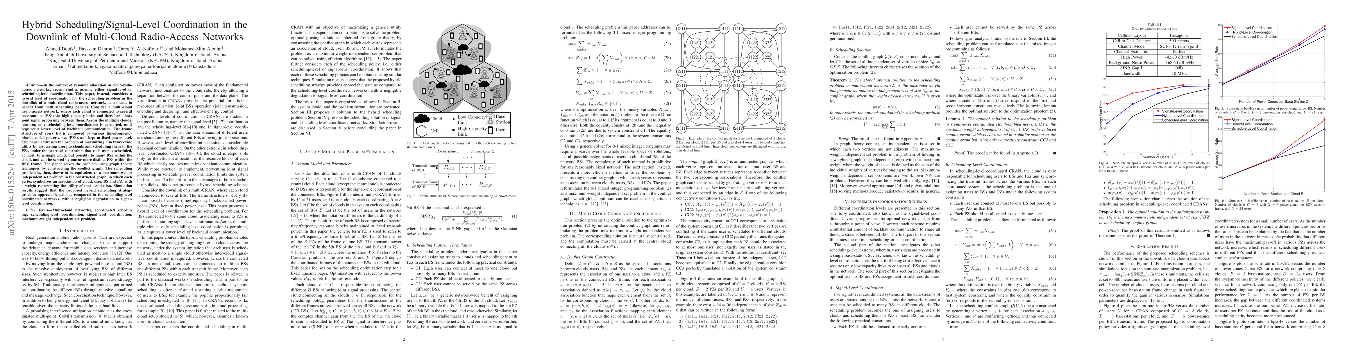 This paper proposes a hybrid scheduling/signal-level coordination approach for downlink multi-cloud radio-access networks to maximize network-wide utility. It leverages joint signal processing across clouds with scheduling-level coordination to balance the benefits of both scheduling and signal-level coordination, achieving significant gains over purely scheduling-level coordinated networks.