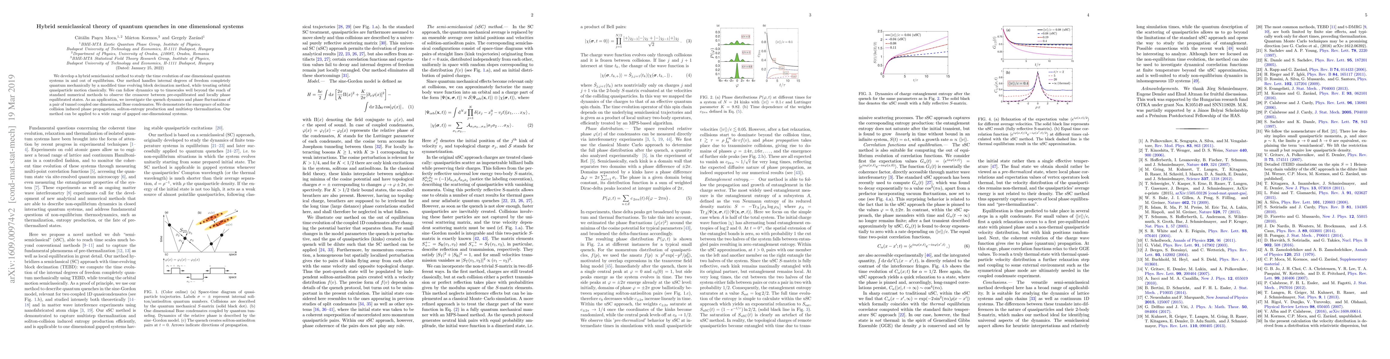 We develop a hybrid semiclassical method to study the time evolution of one dimensional quantum systems in and out of equilibrium. Our method handles internal degrees of freedom completely quantum mechanically by a modified time evolving block decimation method, while treating orbital quasiparticle motion classically. We can follow dynamics up to timescales well beyond the reach of standard numerical methods to observe the crossover between pre-equilibrated and locally phase equilibrated states. As an application, we investigate the quench dynamics and phase fluctuations of a pair of tunnel coupled one dimensional Bose condensates. We demonstrate the emergence of soliton-collision induced phase propagation, soliton-entropy production and multistep thermalization. Our method can be applied to a wide range of gapped one-dimensional systems.