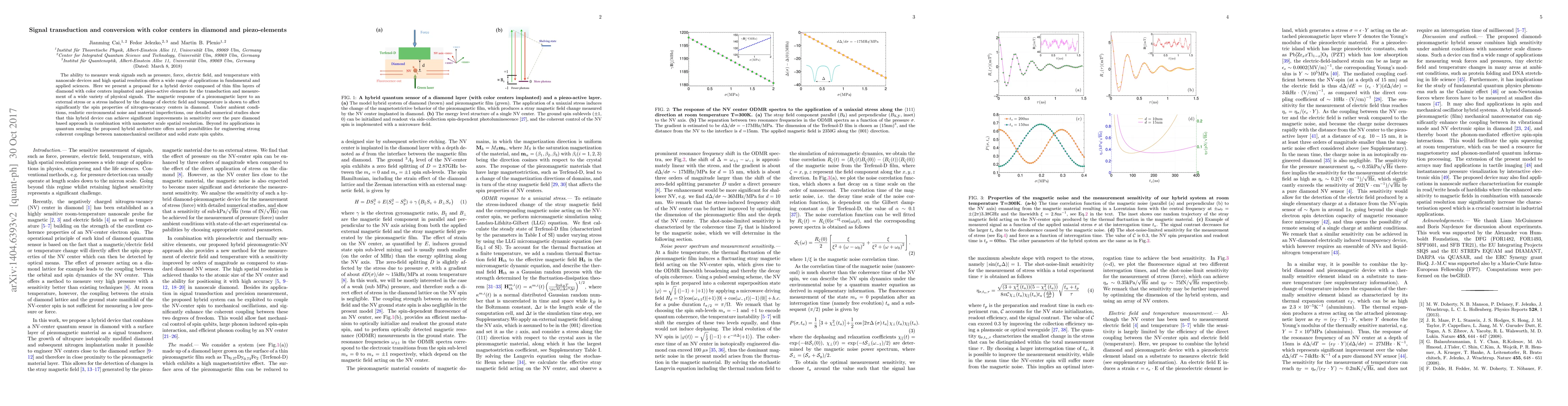 The ability to measure weak signals such as pressure, force, electric field, and temperature with nanoscale devices and high spatial resolution offers a wide range of applications in fundamental and applied sciences. Here we present a proposal for a hybrid device composed of thin film layers of diamond with color centers implanted and piezo-active elements for the transduction and measurement of a wide variety of physical signals. The magnetic response of a piezomagnetic layer to an external stress or a stress induced by the change of electric field and temperature is shown to affect significantly the spin properties of nitrogen-vacancy centers in diamond. Under ambient conditions, realistic environmental noise and material imperfections, our detailed numerical studies show that this hybrid device can achieve significant improvements in sensitivity over the pure diamond based approach in combination with nanometer scale spatial resolution. Beyond its applications in quantum sensing the proposed hybrid architecture offers novel possibilities for engineering strong coherent couplings between nanomechanical oscillator and solid state spin qubits.
