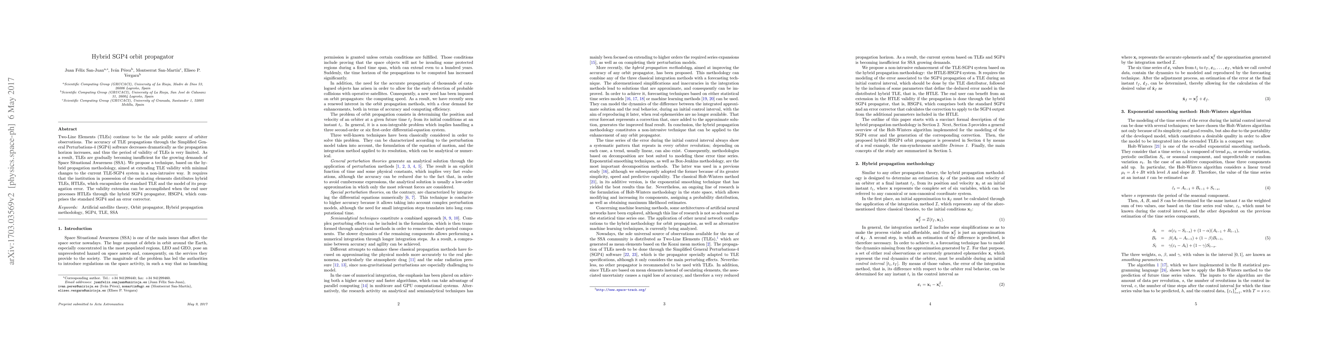Two-Line Elements (TLEs) continue to be the sole public source of orbiter observations. The accuracy of TLE propagations through the Simplified General Perturbations-4 (SGP4) software decreases dramatically as the propagation horizon increases, and thus the period of validity of TLEs is very limited. As a result, TLEs are gradually becoming insufficient for the growing demands of Space Situational Awareness (SSA). We propose a technique, based on the hybrid propagation methodology, aimed at extending TLE validity with minimal changes to the current TLE-SGP4 system in a non-intrusive way. It requires that the institution in possession of the osculating elements distributes hybrid TLEs, HTLEs, which encapsulate the standard TLE and the model of its propagation error. The validity extension can be accomplished when the end user processes HTLEs through the hybrid SGP4 propagator, HSGP4, which comprises the standard SGP4 and an error corrector.