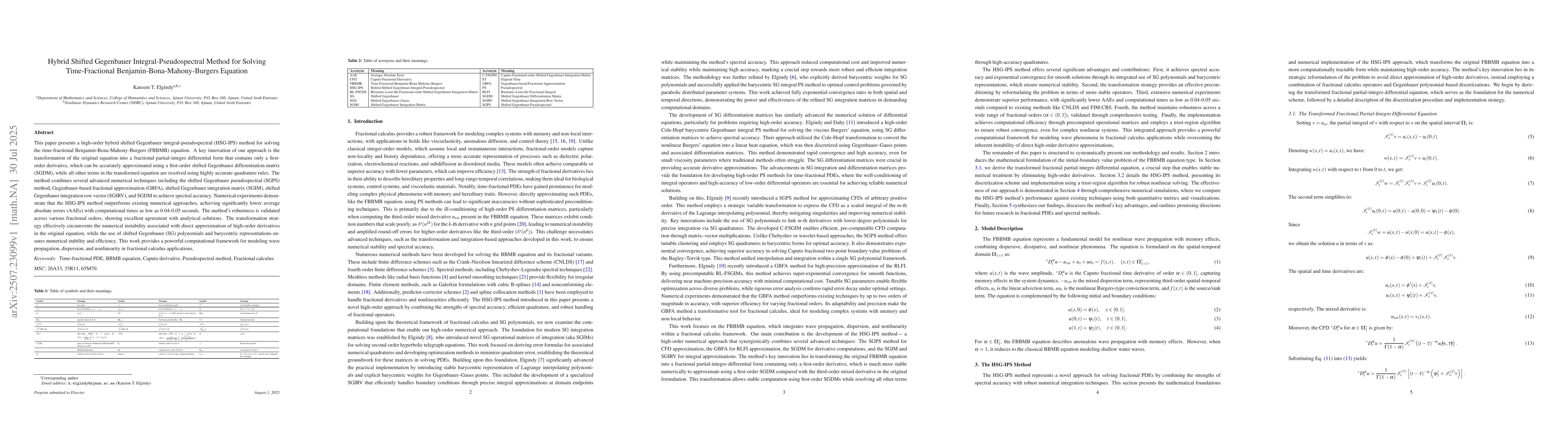The research introduces a Hybrid Shifted Gegenbauer Integral-Pseudospectral (HSG-IPS) method for solving the time-fractional Benjamin-Bona-Mahony-Burgers (FBBMB) equation, transforming it into a fractional partial-integro differential form with a first-order derivative approximated by a shifted Gegenbauer differentiation matrix (SGDM), while other terms are resolved using quadrature rules.
