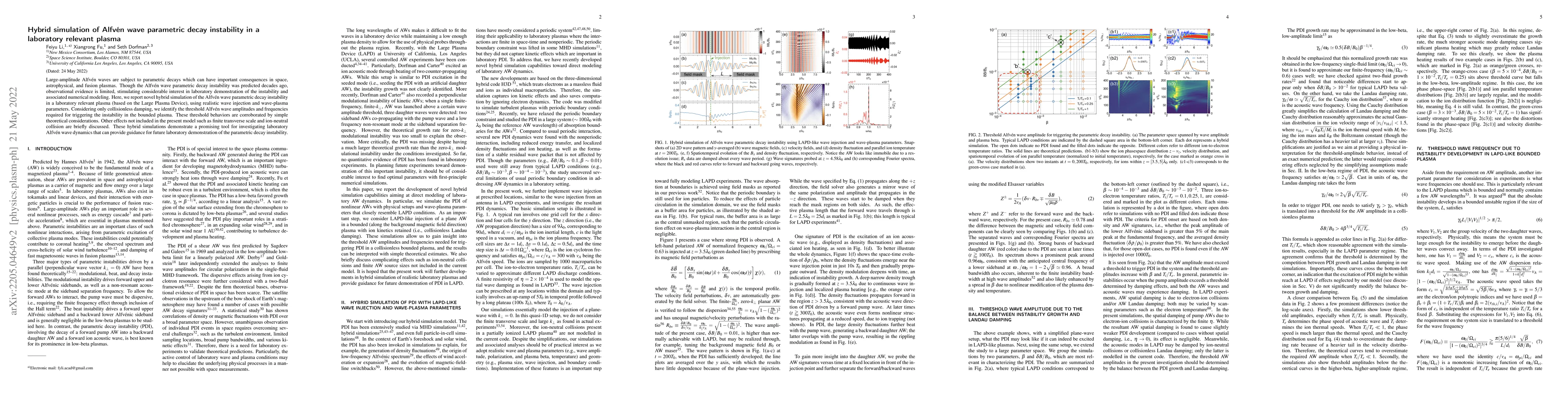 This paper presents a hybrid simulation of Alfvén wave parametric decay instability in a laboratory plasma, using the Large Plasma Device. The study identifies the threshold conditions for triggering the instability, corroborated by theoretical analysis, and highlights the potential of such simulations for future investigations.