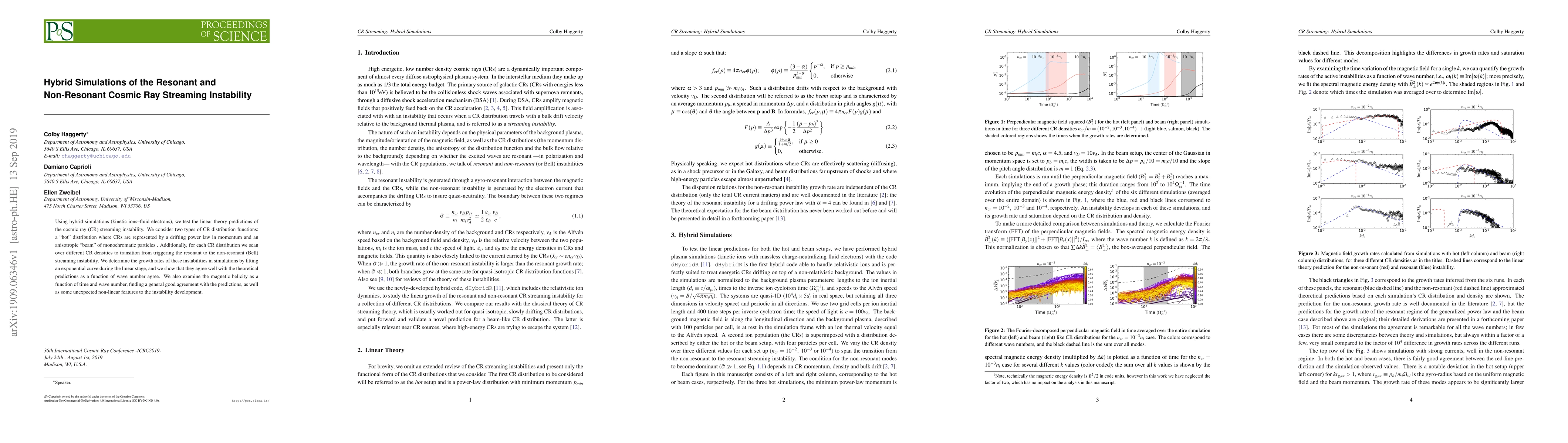 This paper uses hybrid simulations to test linear theory predictions of the cosmic ray streaming instability, comparing "hot" power-law and anisotropic beam distributions. The study finds good agreement between simulation growth rates and theoretical predictions, along with some unexpected non-linear features in magnetic helicity.
