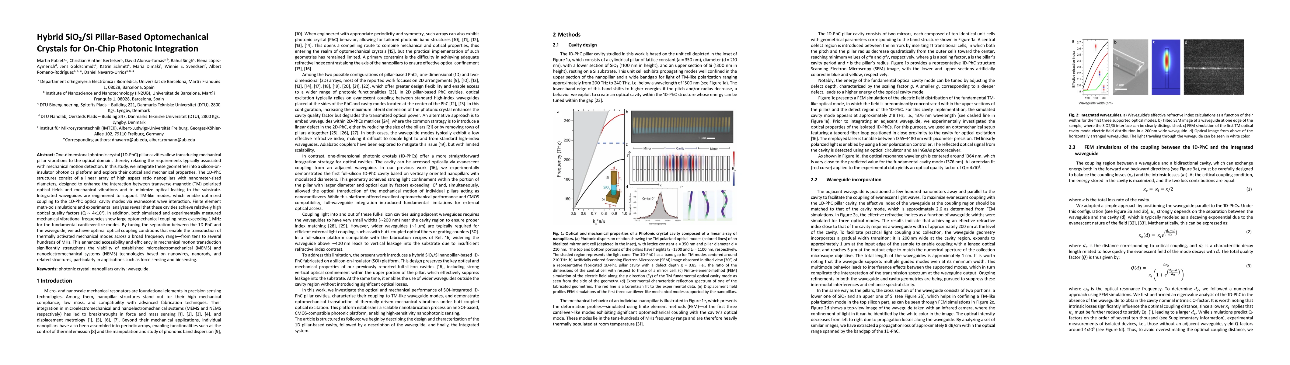 The research integrates 1D-PhC structures into a silicon-on-insulator photonics platform, utilizing high aspect ratio nanopillars for enhanced optical-mechanical interaction and minimized optical leakage. Waveguides are engineered to support TM-like modes for optimized coupling to 1D-PhC cavity modes via evanescent wave interaction.