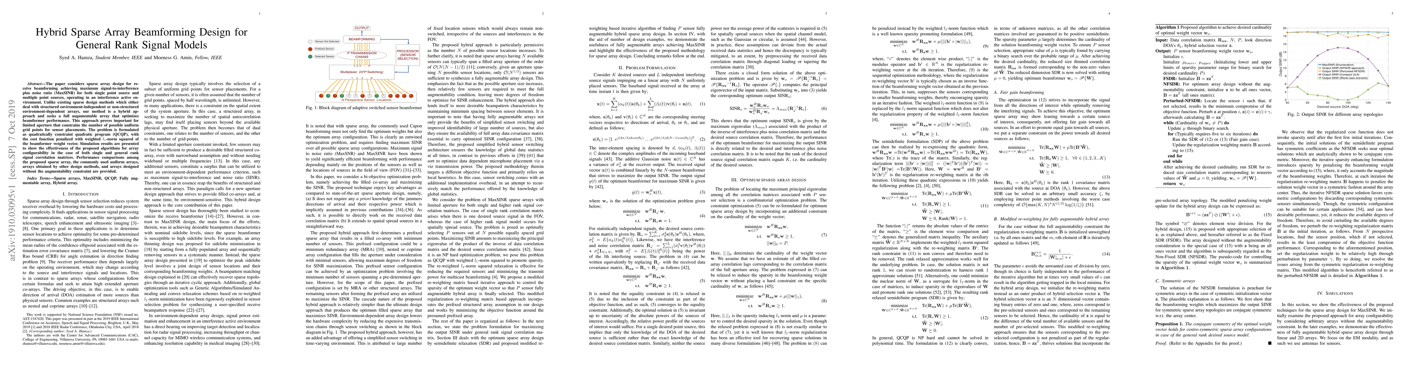 The paper considers sparse array design for receive beamforming achieving maximum signal-to-interference plus noise ratio (MaxSINR) for both single point source and multiple point sources, operating in an interference active environment. Unlike existing sparse design methods which either deal with structured environment-independent or non-structured environment-dependent arrays, our method is a hybrid approach and seeks a full augumentable array that optimizes beamformer performance. This approach proves important for limited aperture that constrains the number of possible uniform grid points for sensor placements. The problem is formulated as quadratically constraint quadratic program (QCQP), with the cost function penalized with weighted l_1-norm squared of the beamformer weight vector. Simulation results are presented to show the effectiveness of the proposed algorithms for array configurability in the case of both single and general rank signal correlation matrices. Performance comparisons among the proposed sparse array, the commonly used uniform arrays, arrays obtained by other design methods, and arrays designed without the augmentability constraint are provided.