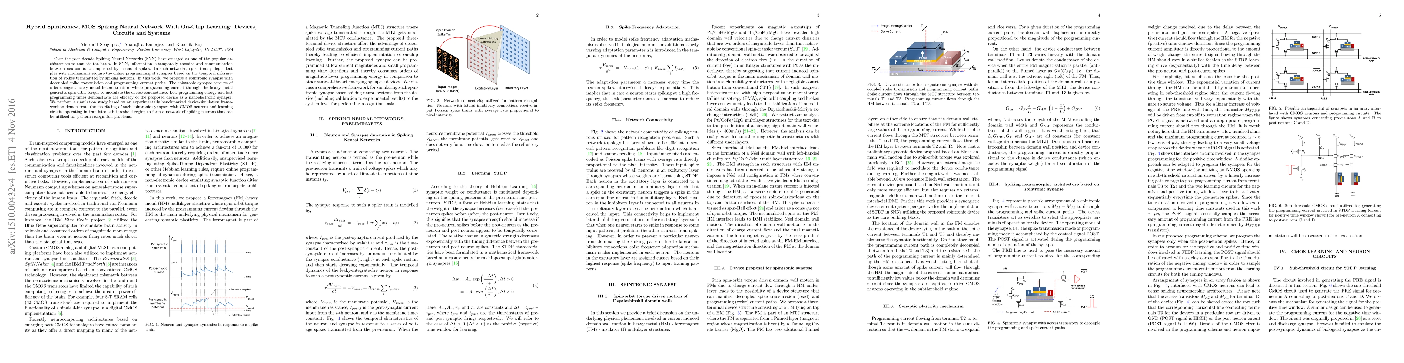 This paper proposes a hybrid spintronic-CMOS Spiking Neural Network with an on-chip learning mechanism, utilizing spintronic synapses for low-energy, fast synaptic programming. The spintronic synapse, based on a ferromagnet-heavy metal heterostructure, modulates conductance via spin-orbit torque, enabling efficient integration with CMOS neurons for pattern recognition tasks.
