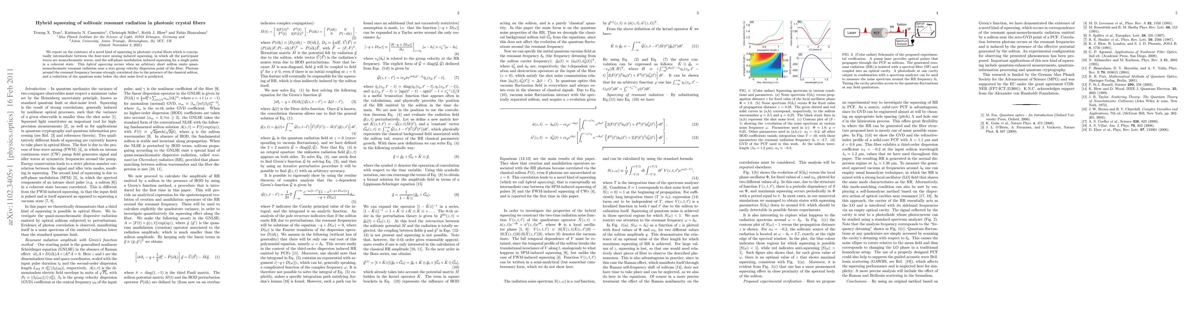 We report on the existence of a novel kind of squeezing in photonic crystal fibers which is conceptually intermediate between the four-wave mixing induced squeezing, in which all the participant waves are monochromatic waves, and the self-phase modulation induced squeezing for a single pulse in a coherent state. This hybrid squeezing occurs when an arbitrary short soliton emits quasi-monochromatic resonant radiation near a zero group velocity dispersion point of the fiber. Photons around the resonant frequency become strongly correlated due to the presence of the classical soliton, and a reduction of the quantum noise below the shot noise level is predicted.