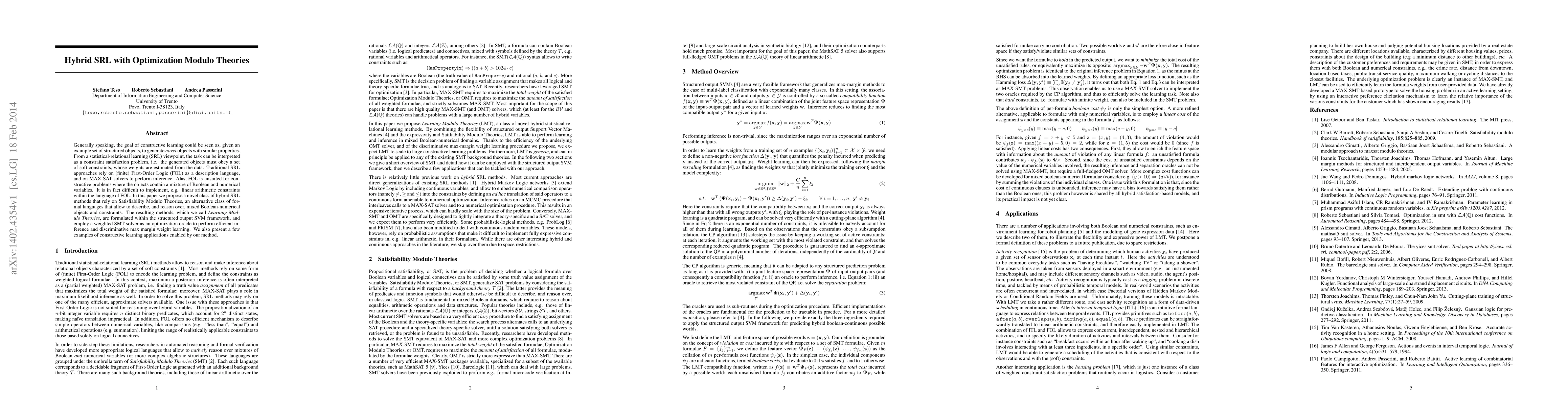 This paper proposes a novel hybrid statistical-relational learning (SRL) method using Satisfiability Modulo Theories (SMT) to handle mixed Boolean and numerical variables, addressing the limitations of traditional First-Order Logic (FOL) in constructive learning tasks. The proposed Learning Modulo Theories leverages SMT solvers for efficient inference and discriminative weight learning within the structured output SVM framework.
