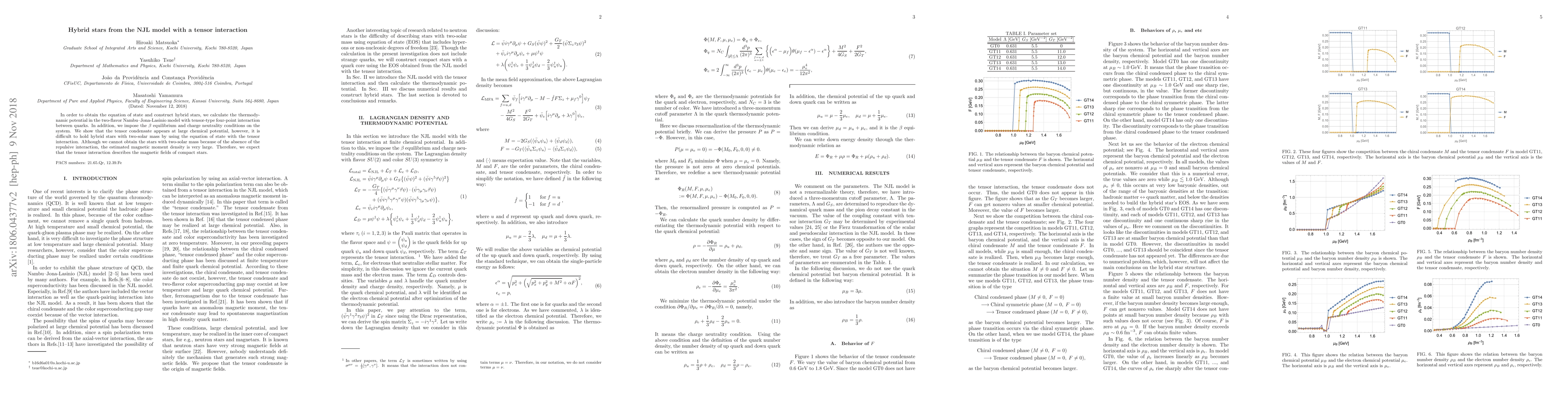 In order to obtain the equation of state and construct hybrid stars, we calculate the thermodynamic potential in the two-flavor Nambu--Jona-Lasinio model with tensor-type four-point interaction between quarks. In addition, we impose the beta equilibrium and charge neutrality conditions on the system. We show that the tensor condensate appears at large chemical potential, however, it is difficult to hold hybrid stars with two-solar mass by using the equation of state with the tensor interaction. Although we cannot obtain the stars with two-solar mass because of the absense of the repulsive interaction, the estimated magnetic moment density is very large. Therefore, we expect that the tensor interaction descrobes the magnetic fields of compact stars.