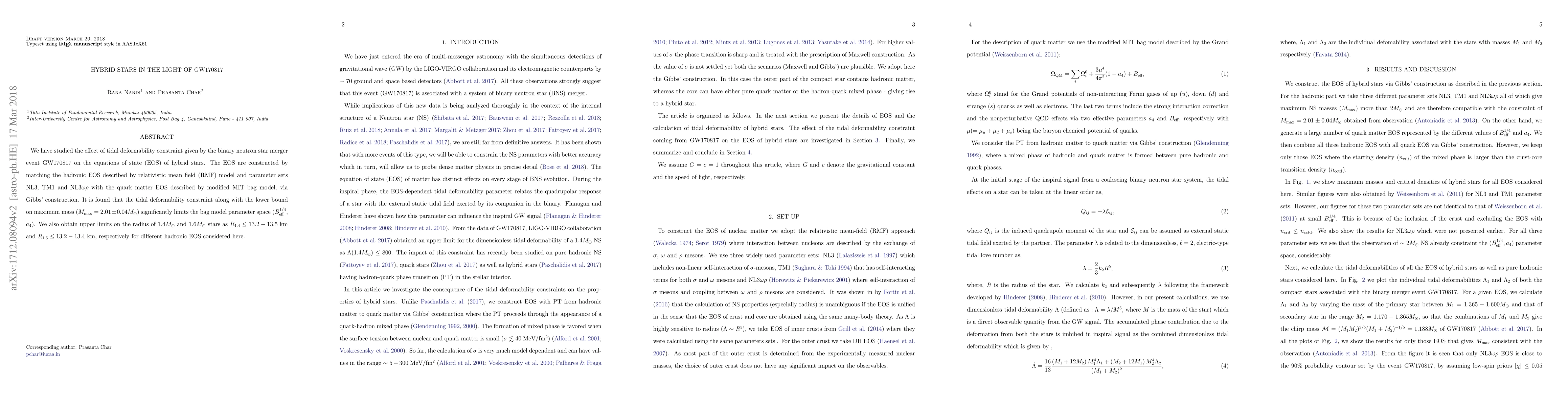 We have studied the effect of tidal deformability constraint given by the binary neutron star merger event GW170817 on the equations of state (EOS) of hybrid stars. The EOS are constructed by matching the hadronic EOS described by relativistic mean field (RMF) model and parameter sets NL3, TM1 and NL3$\omega\rho$ with the quark matter EOS described by modified MIT bag model, via Gibbs' construction. It is found that the tidal deformability constraints along with the lower bound on maximum mass ($M_{\rm max}=2.01\pm0.04M_\odot$) significantly limit the bag model parameter space ($B_{\rm eff}^{1/4}$, $a_4$). We also obtain upper limits on the radius of $1.4M_\odot$ and $1.6M_\odot$ stars as $R_{1.4}\leq13.2-13.5$ km and $R_{1.6}\leq13.2-13.4$ km, respectively for different hadronic EOS considered here.