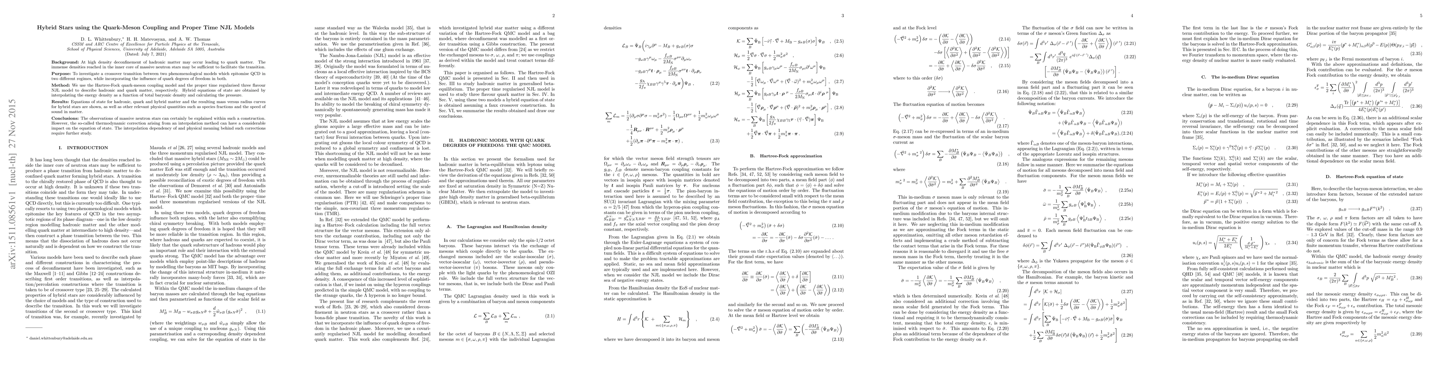 Background: At high density deconfinement of hadronic matter may occur leading to quark matter. The immense densities reached in the inner core of massive neutron stars may be sufficient to facilitate the transition. Purpose: To investigate a crossover transition between two phenomenological models which epitomise QCD in two different regimes, while incorporating the influence of quark degrees of freedom in both. Method: We use the Hartree-Fock quark-meson coupling model and the proper time regularised three flavour NJL model to describe hadronic and quark matter, respectively. Hybrid equations of state are obtained by interpolating the energy density as a function of total baryonic density and calculating the pressure. Results: Equations of state for hadronic, quark and hybrid matter and the resulting mass versus radius curves for hybrid stars are shown, as well as other relevant physical quantities such as species fractions and the speed of sound in matter. Conclusions: The observations of massive neutron stars can certainly be explained within such a construction. However, the so-called thermodynamic correction arising from an interpolation method can have a considerable impact on the equation of state. The interpolation dependency of and physical meaning behind such corrections require further study.