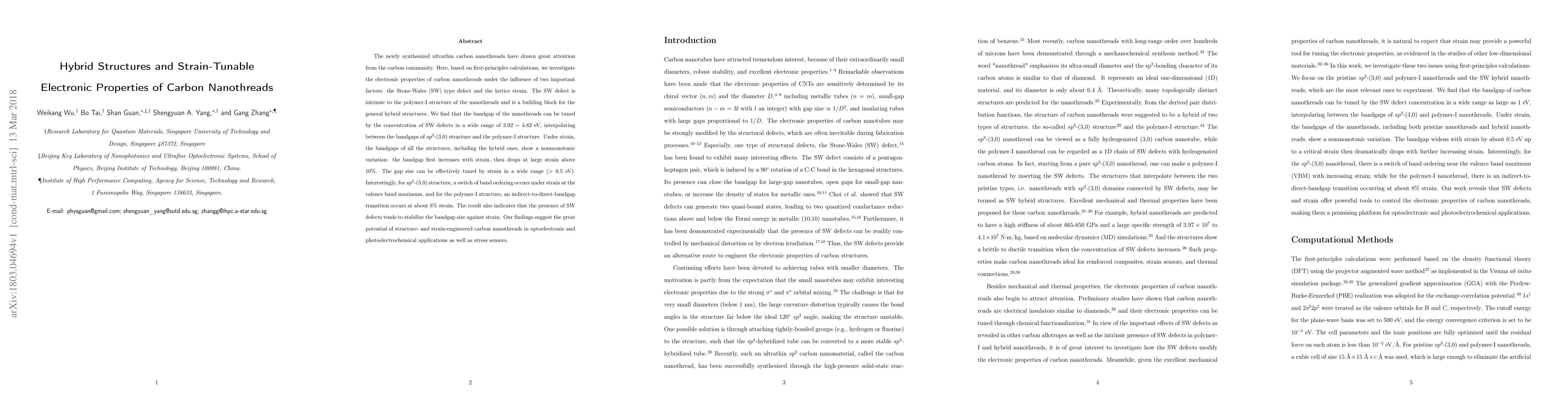 The newly synthesized ultrathin carbon nanothreads have drawn great attention from the carbon community. Here, based on first-principles calculations, we investigate the electronic properties of carbon nanothreads under the influence of two important factors: the Stone-Wales (SW) type defect and the lattice strain. The SW defect is intrinsic to the polymer-I structure of the nanothreads and is a building block for the general hybrid structures. We find that the bandgap of the nanothreads can be tuned by the concentration of SW defects in a wide range of $3.92 \sim 4.82$ eV, interpolating between the bandgaps of $sp^{3}$-(3,0) structure and the polymer-I structure. Under strain, the bandgaps of all the structures, including the hybrid ones, show a nonmonotonic variation: the bandgap first increases with strain, then drops at large strain above 10%. The gap size can be effectively tuned by strain in a wide range ($>0.5$ eV). Interestingly, for $sp^{3}$-(3,0) structure, a switch of band ordering occurs under strain at the valence band maximum, and for the polymer-I structure, an indirect-to-direct-bandgap transition occurs at about 8% strain. The result also indicates that the presence of SW defects tends to stabilize the bandgap size against strain. Our findings suggest the great potential of structure- and strain-engineered carbon nanothreads in optoelectronic and photoelectrochemical applications as well as stress sensors.