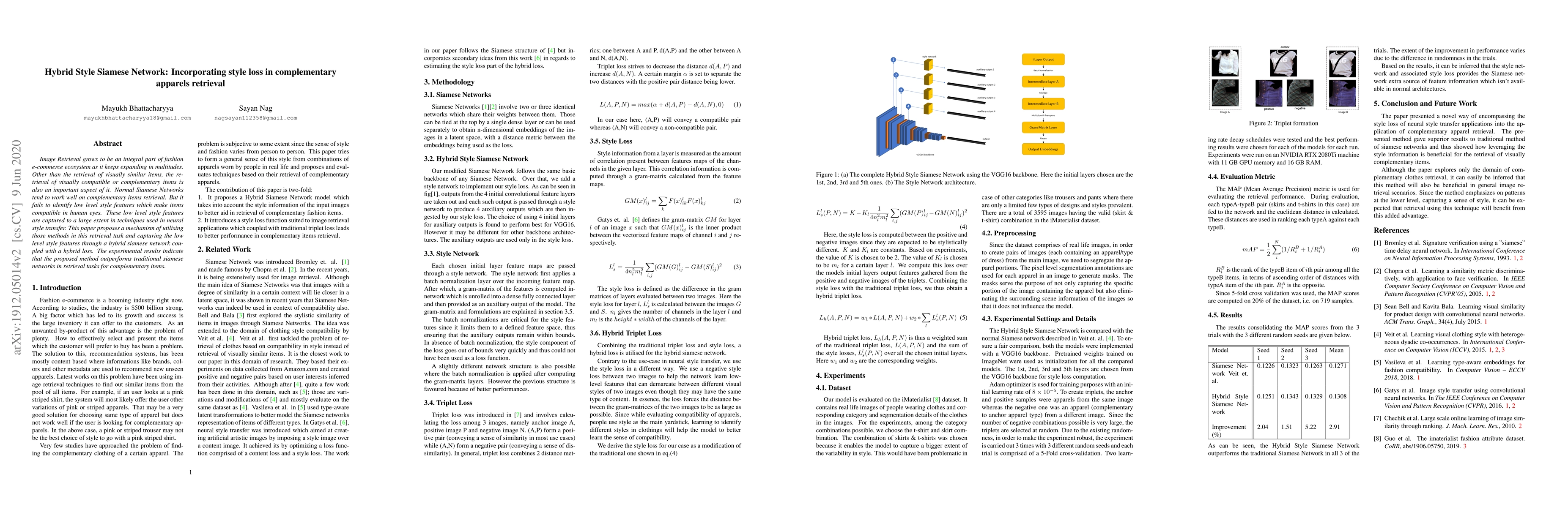 This paper proposes a hybrid style Siamese network that incorporates style loss to improve the retrieval of visually compatible apparel items in fashion e-commerce. The method outperforms traditional Siamese networks by capturing low-level style features through a hybrid loss, enhancing the identification of complementary items.