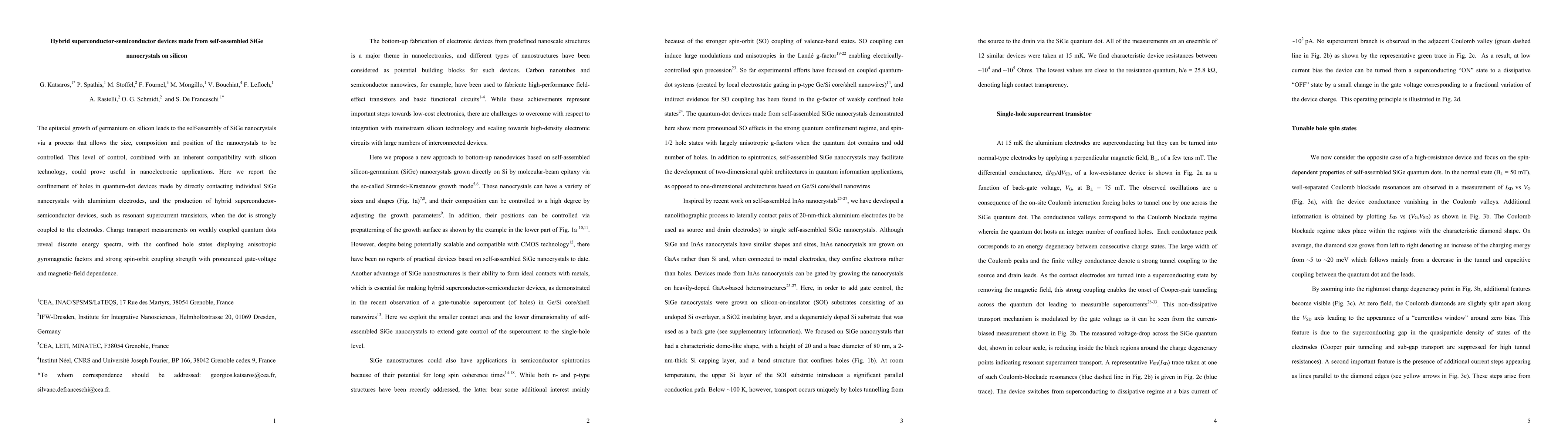This paper reports the creation of hybrid superconductor-semiconductor devices using self-assembled SiGe nanocrystals on silicon, demonstrating the confinement of holes in quantum-dot devices and the production of resonant supercurrent transistors. Charge transport measurements show discrete energy spectra and strong spin-orbit coupling in the confined hole states.