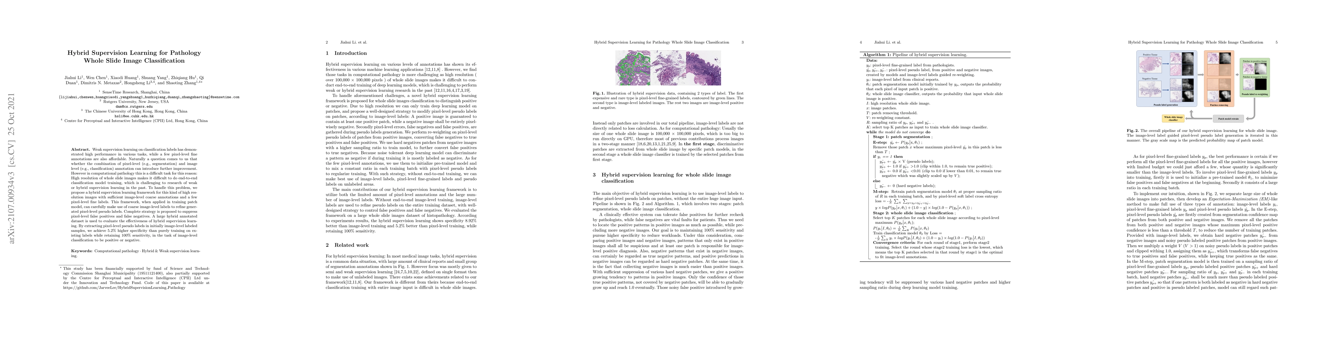 This paper proposes a hybrid supervision learning framework to improve the classification of high-resolution pathology whole slide images using both image-level and pixel-level annotations. The framework effectively utilizes coarse image-level labels to refine pixel-level pseudo labels, achieving 5.2% higher specificity while maintaining 100% sensitivity compared to training solely on existing labels.