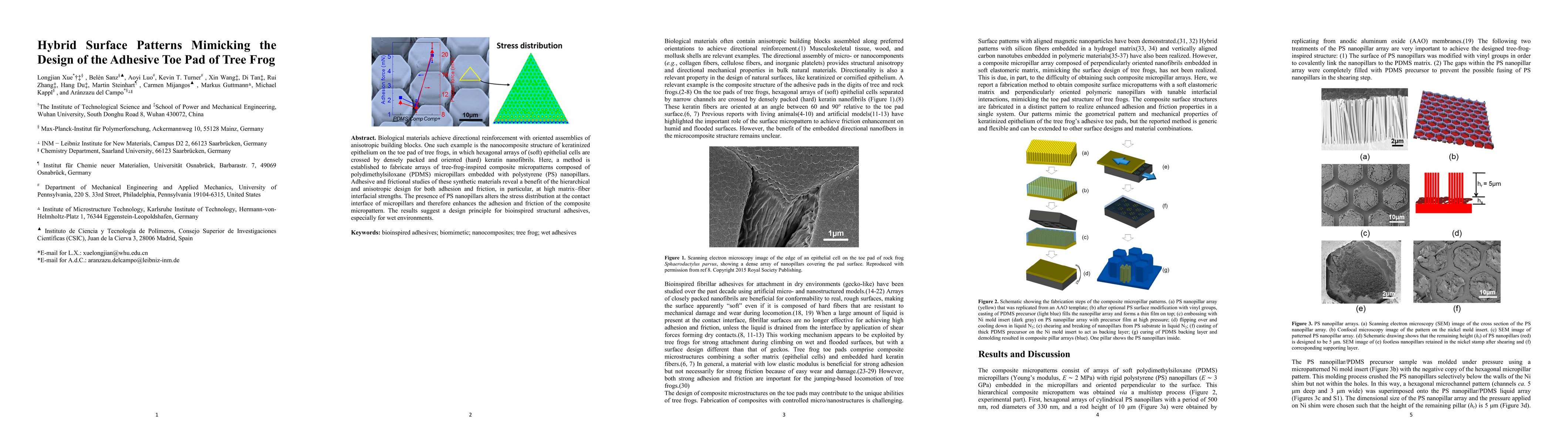 Researchers created hybrid surface patterns inspired by tree frog toe pads, which enhanced adhesion and friction in wet environments. The design principle could lead to bioinspired structural adhesives with improved performance.